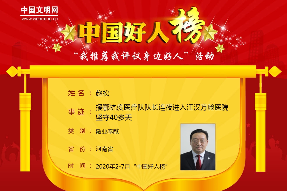 9月17日,由中央文明办主办,中国文明网承办的“我推荐我评议身边好人”活动发布了2020年2-7月“中国好人榜”榜单,必赢76net线路官网第一附属医院副院长赵松名列其中 。