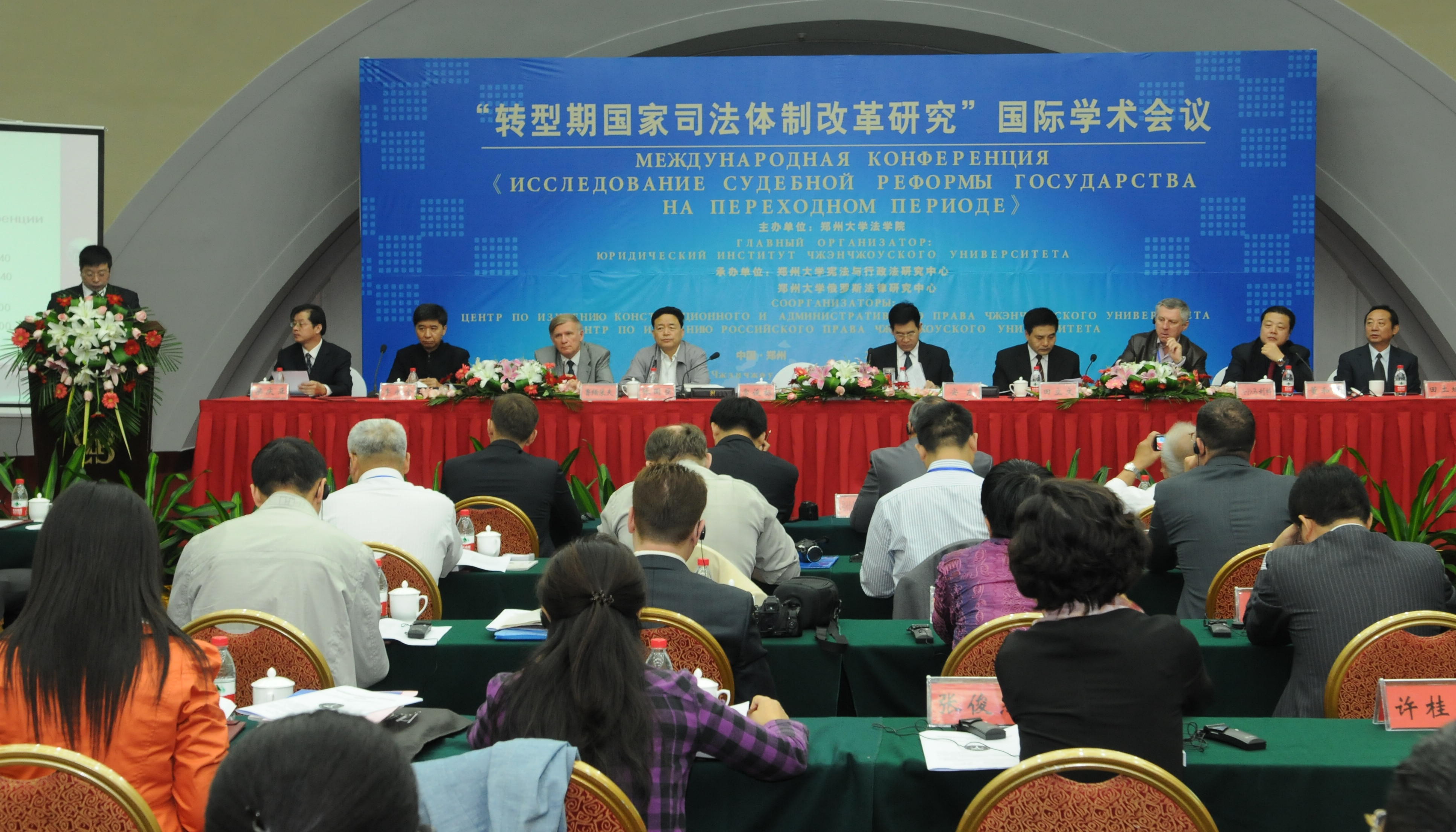 由我校法学院主办的国际学术研讨会10月13日在郑州召开。陕西省委常委、政法委书记、高级人民法院院长安东,河南省高级人民法院常务副院长田立文,河南省检察院常务副检察长张国臣,中国宪法学研究会副会长董和平教授,中国社科院俄罗斯东欧中亚研究所副所长李永全教授,我校副校长常俊标出席了会议。会议特别邀请了俄罗斯联邦功勋法学家、退休高级法官、奔萨国立大学司法教研室主任В.А.捷廖欣教授,俄罗斯联邦功勋法学家、俄罗斯科学院国家与法研究所萨拉托夫分所所长А.В. 马利科教授,俄罗斯联邦功勋法学家、贝加尔国立经济与法律大学副校长В·Н·安德里亚诺夫教授与会。来自中国社会科学院、中国青年政治学院、山东大学、西南政法大学的80余名国内外专家学者参加了本次会议。