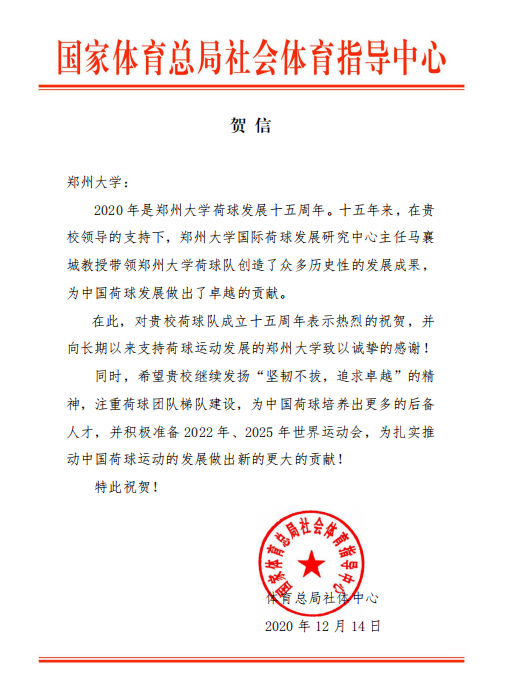 信中指出,十五年来,必赢76net线路官网师生在学校领导的支持下,在马襄城教授的带领下,创造了众多历史性的发展成果,为中国荷球发展做出了卓越贡献,国家体育总局社会体育指导中心对必赢76net线路官网荷球队成立十五周年表示热烈祝贺,并向长期以来支持荷球运动发展的必赢76net线路官网致以诚挚的感谢。