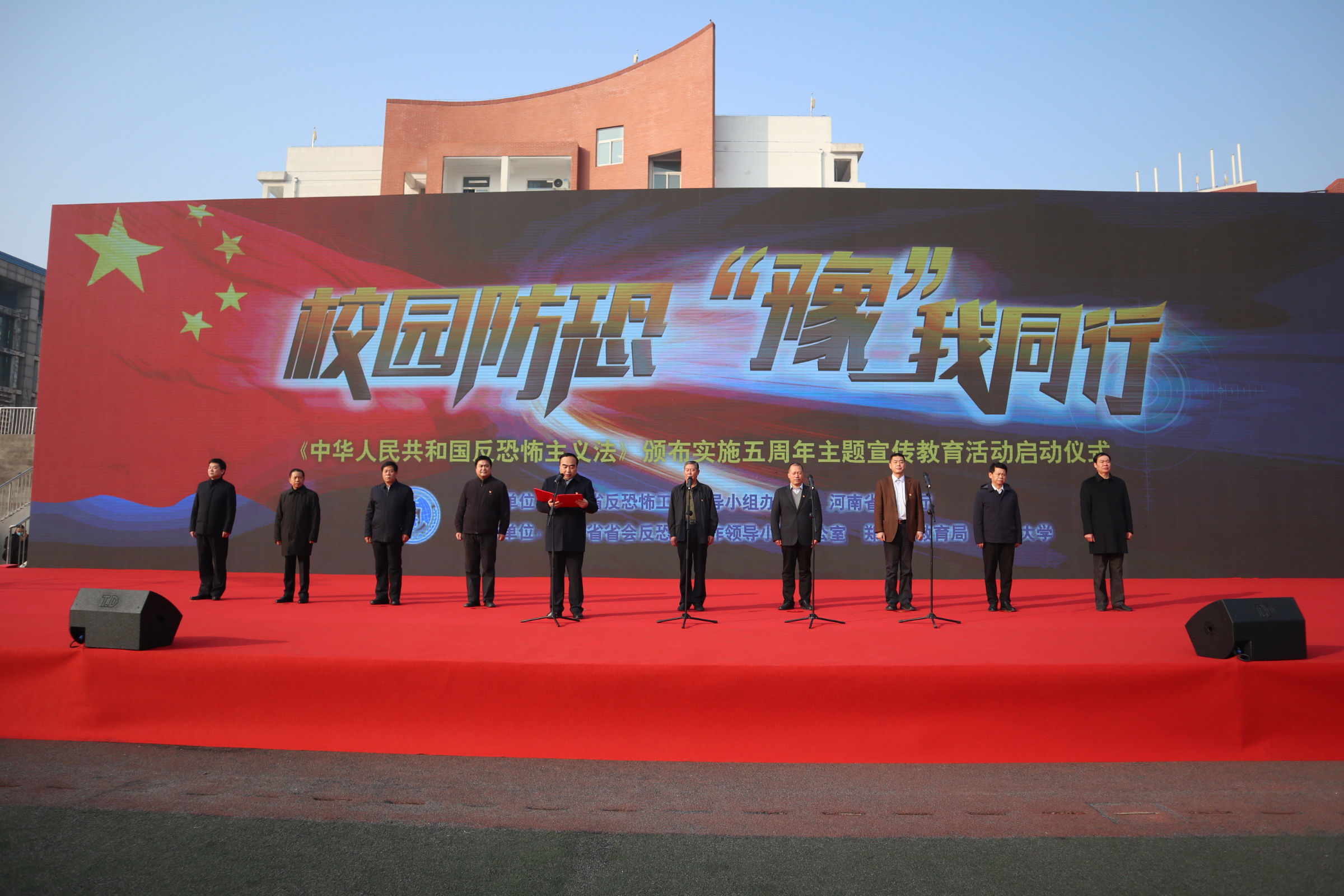 为深入贯彻习近平新时代中国特色社会主义思想,落实习近平总书记关于防范风险挑战、应对突发事件的重要论述和指示精神,12月27日,《中华人民共和国反恐怖主义法》颁布五周年暨“校园防恐﹒豫我同行”主题宣传教育活动启动仪式在必赢76net线路官网举行。河南省反恐办主任、省公安厅副厅长鲁恩,河南省教育厅党组成员、副厅长张传广,河南省省会反恐怖工作领导小组组长、郑州市政法委书记于东辉出席启动仪式。校党委常委、副校长吴宏阳出席活动并致辞,保卫处等相关部门负责同志参加活动。