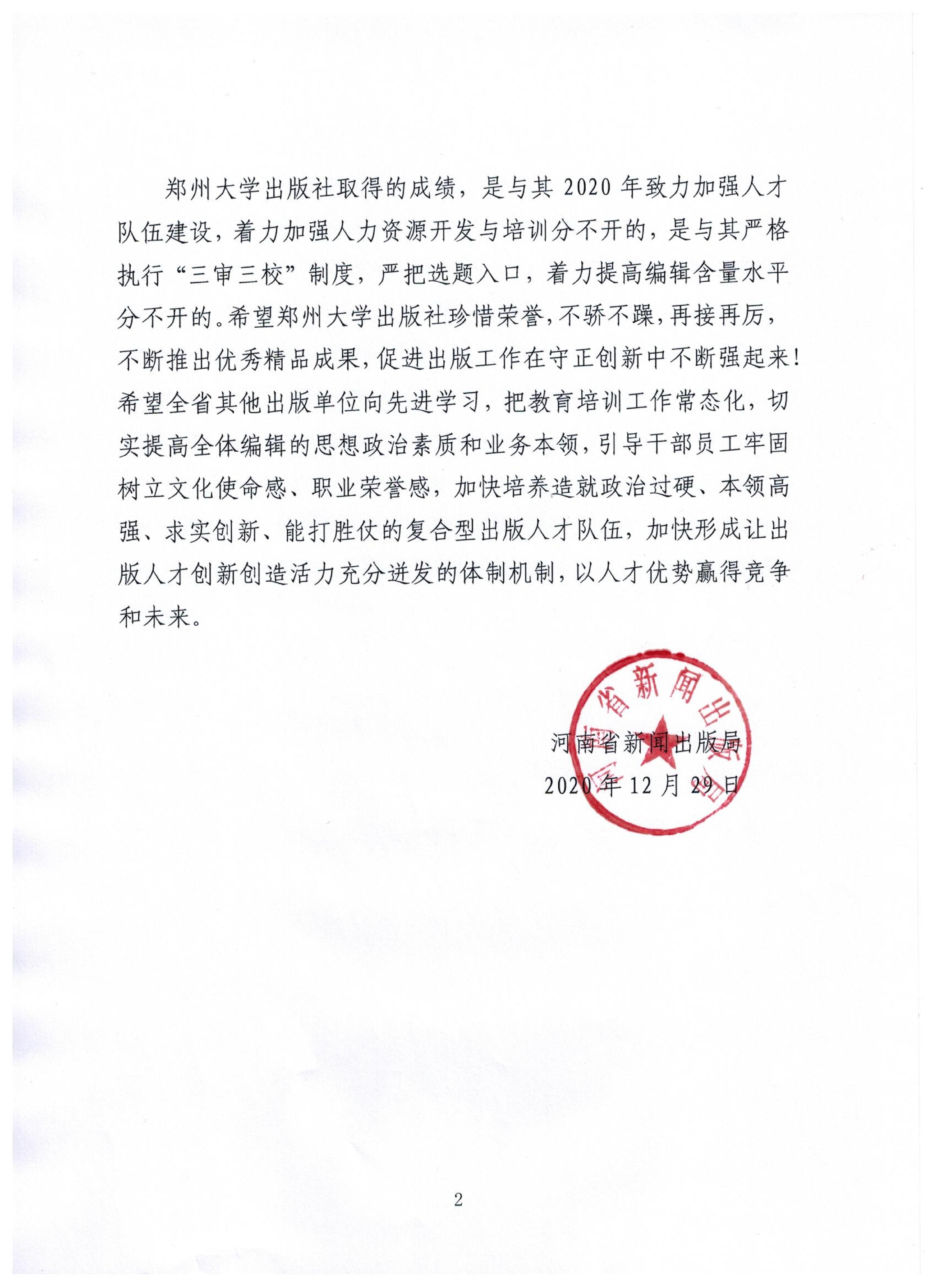 2020年12月29日,河南省新闻出版局向全省出版单位及主管主办单位下发《关于通报表扬必赢76net线路官网出版社的通知》,对必赢76net线路官网出版社近期在人才队伍建设方面取得的成绩给予专门通报表扬。
