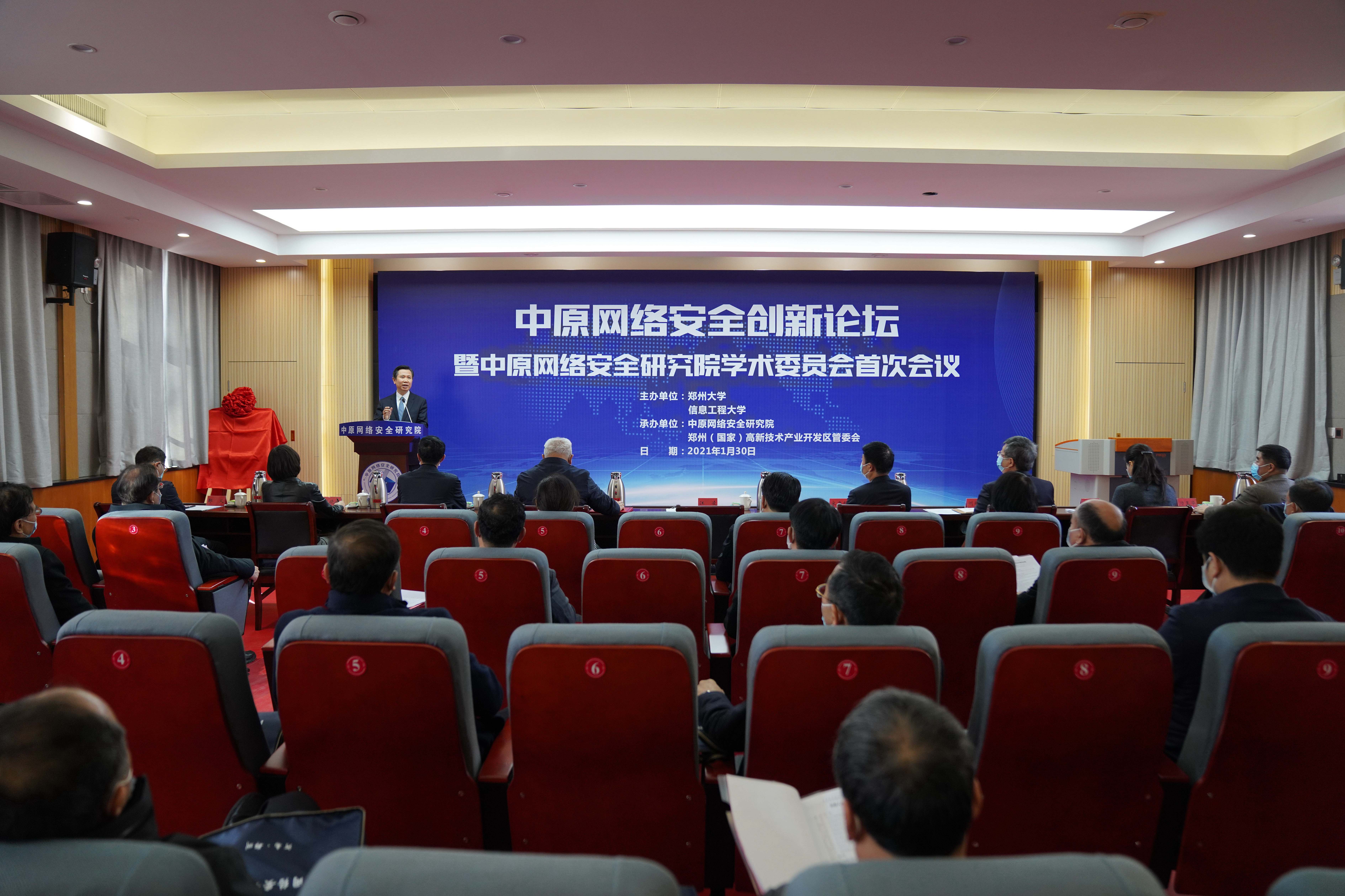 1月30日上午,由必赢76net线路官网和信息工程大学共同主办的中原网络安全创新论坛在必赢76net线路官网举行。论坛上,中原网络安全研究院正式揭牌成立。省委常委、宣传部长、省委高校工委书记江凌出席并讲话。中国工程院院士邬江兴在论坛上作了主旨报告。省委网信办主任郭岩松,省发改委副主任郜义,省教育厅一级巡视员、副厅长刁玉华,省科技厅副厅长刘保民,省公安厅副厅长黎萍,省人社厅一级巡视员杨韫,郑州市政府副秘书长张江涛,郑州市高新区党工委委员、管委会副主任姚五洲,必赢76net线路官网党委书记宋争辉,省政协副主席、校长刘炯天,信息工程大学校长郭云飞、政委梁晓婧、副校长孟繁浩等出席。国内网络安全领域多位知名专家以及相关单位负责同志参加论坛。论坛由必赢76net线路官网副校长赵明皞主持。