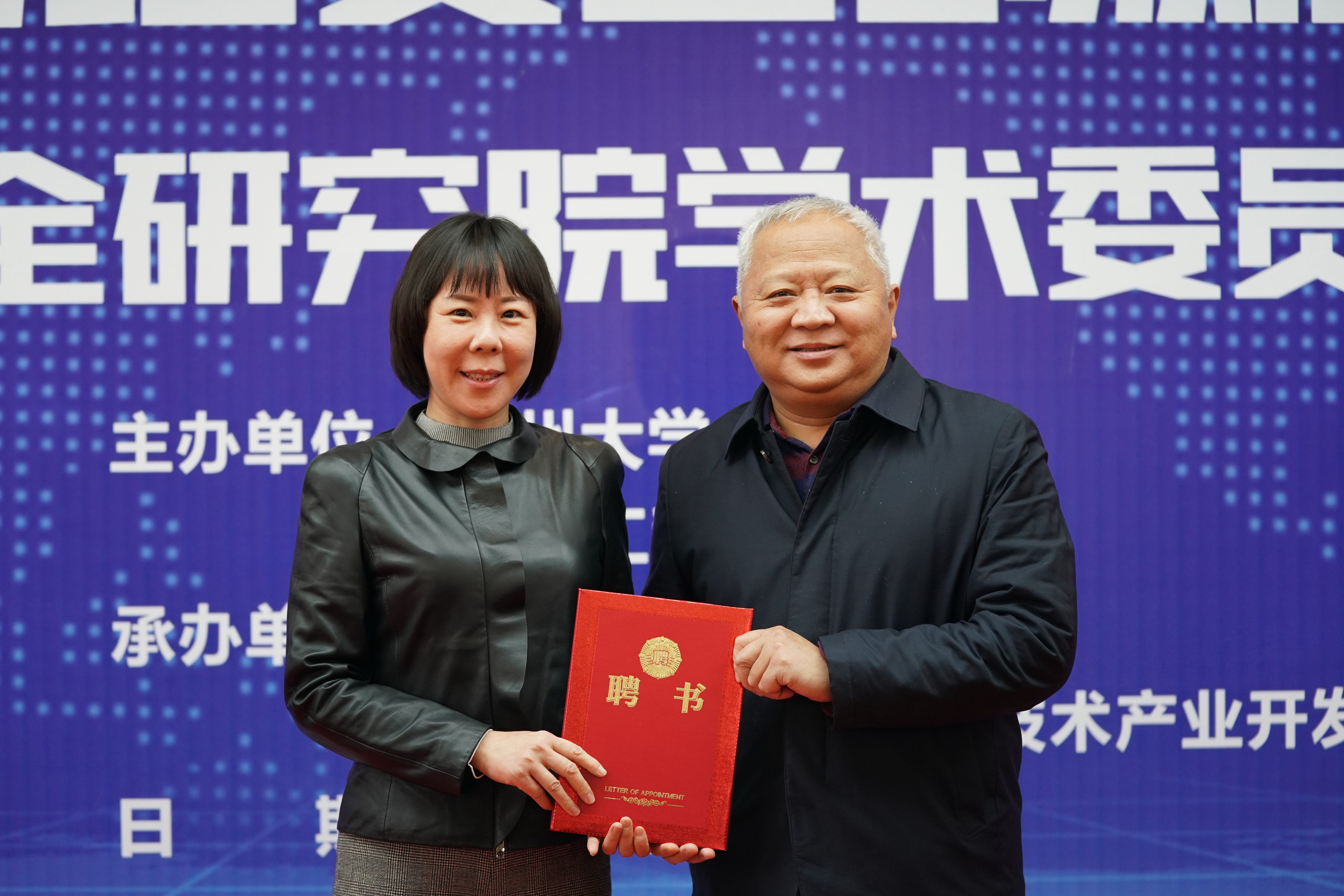 宋争辉为中原网络安全研究院院长胡传平、副院长石磊、索敏杰、张大龙颁发了聘书。梁晓婧为学术委员会主任邬江兴颁发了聘书。邬江兴和刘炯天为中原网络安全研究院揭牌。中原网络安全研究院院长胡传平汇报了研究院建设规划。