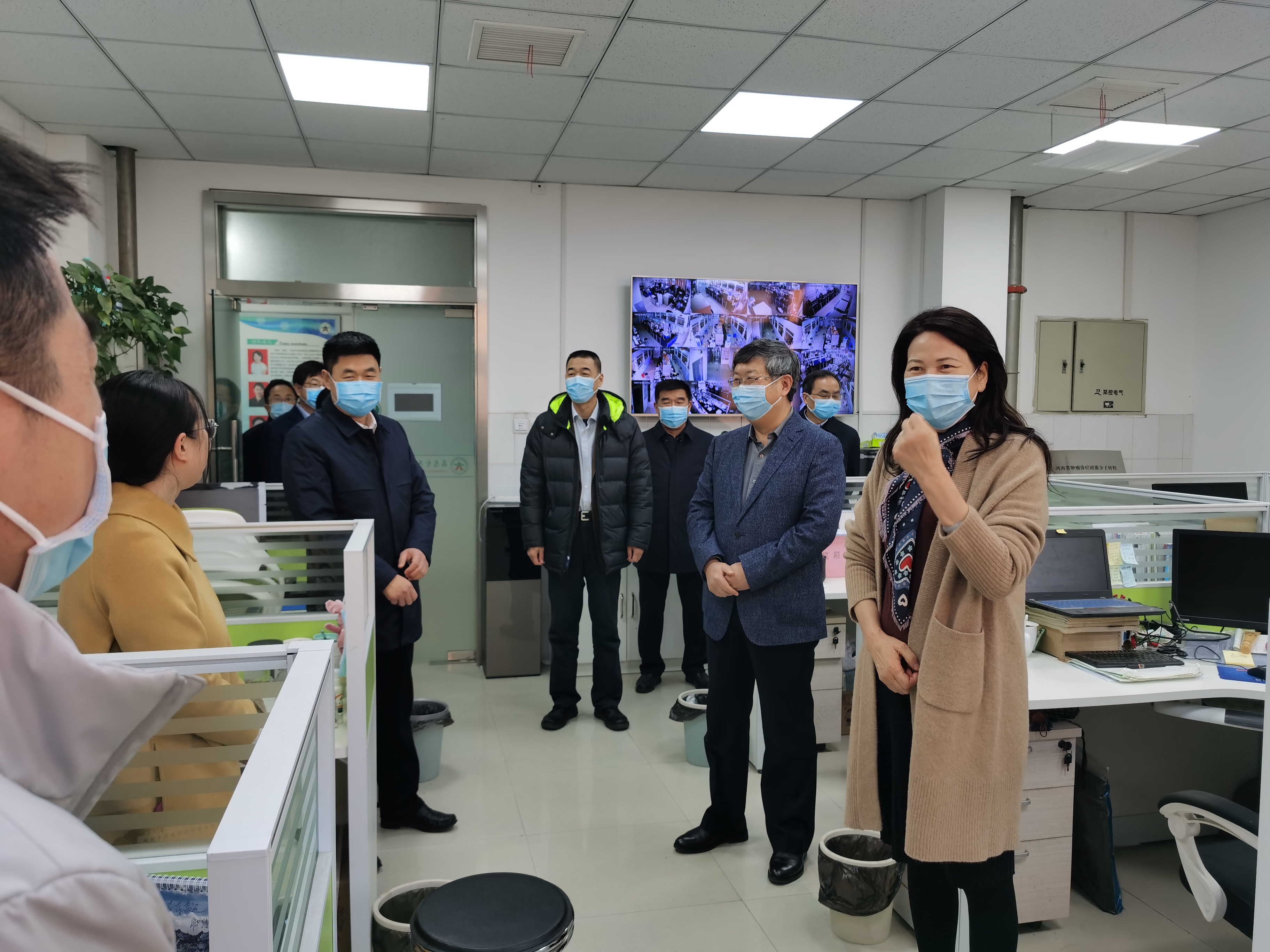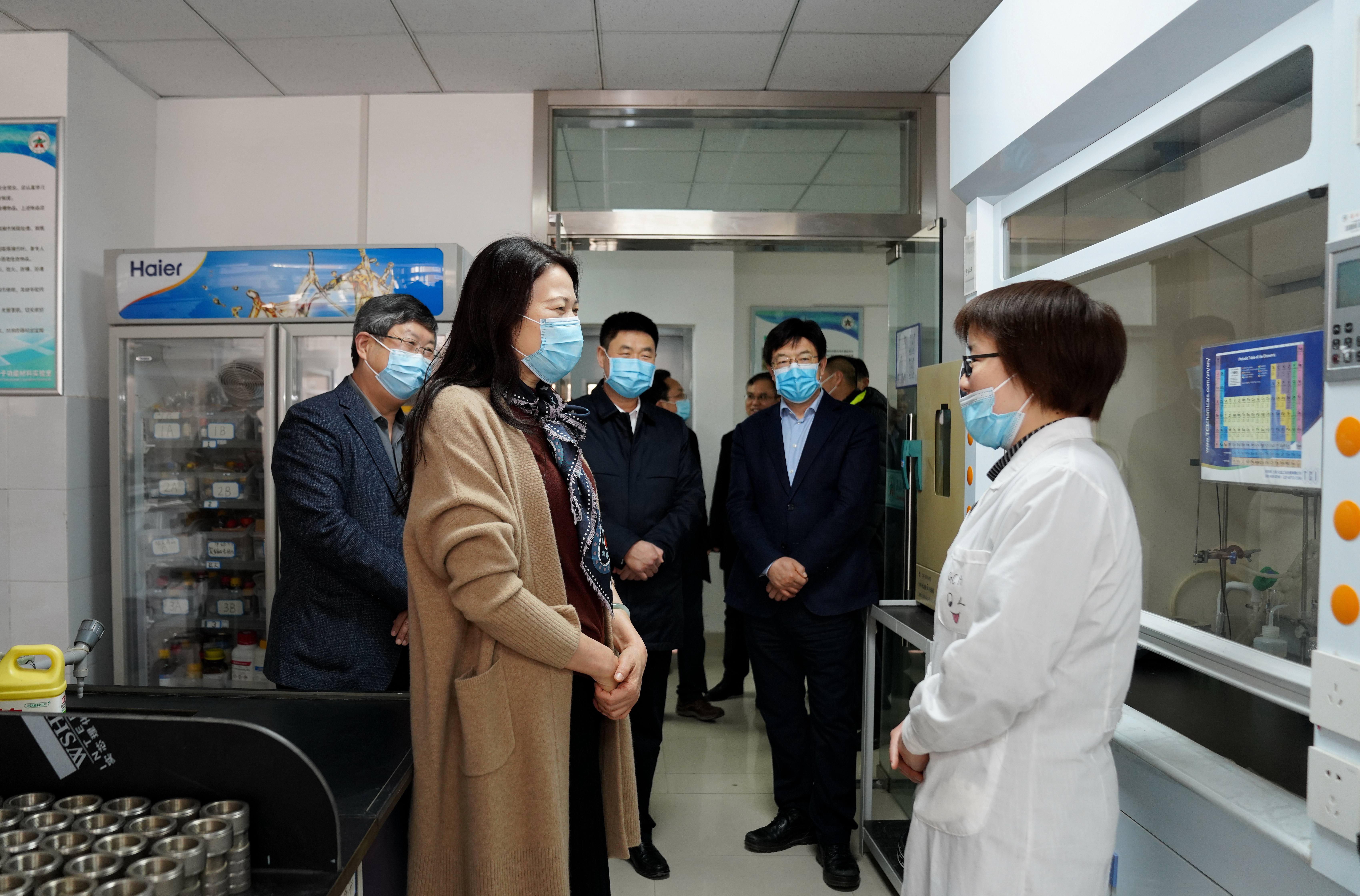 在生命科学学院分子免疫学实验室,霍金花一行看望了留校学生以及坚守工作岗位的青年教师。当了解到王爱萍教授团队承担有动物新冠肺炎流调项目,正在准备样品稀释液等采样用原材料并寄往全国各地时,霍金花表示赞许,并与团队师生进行亲切交谈,详细了解实验室留校学生人数及具体情况。
