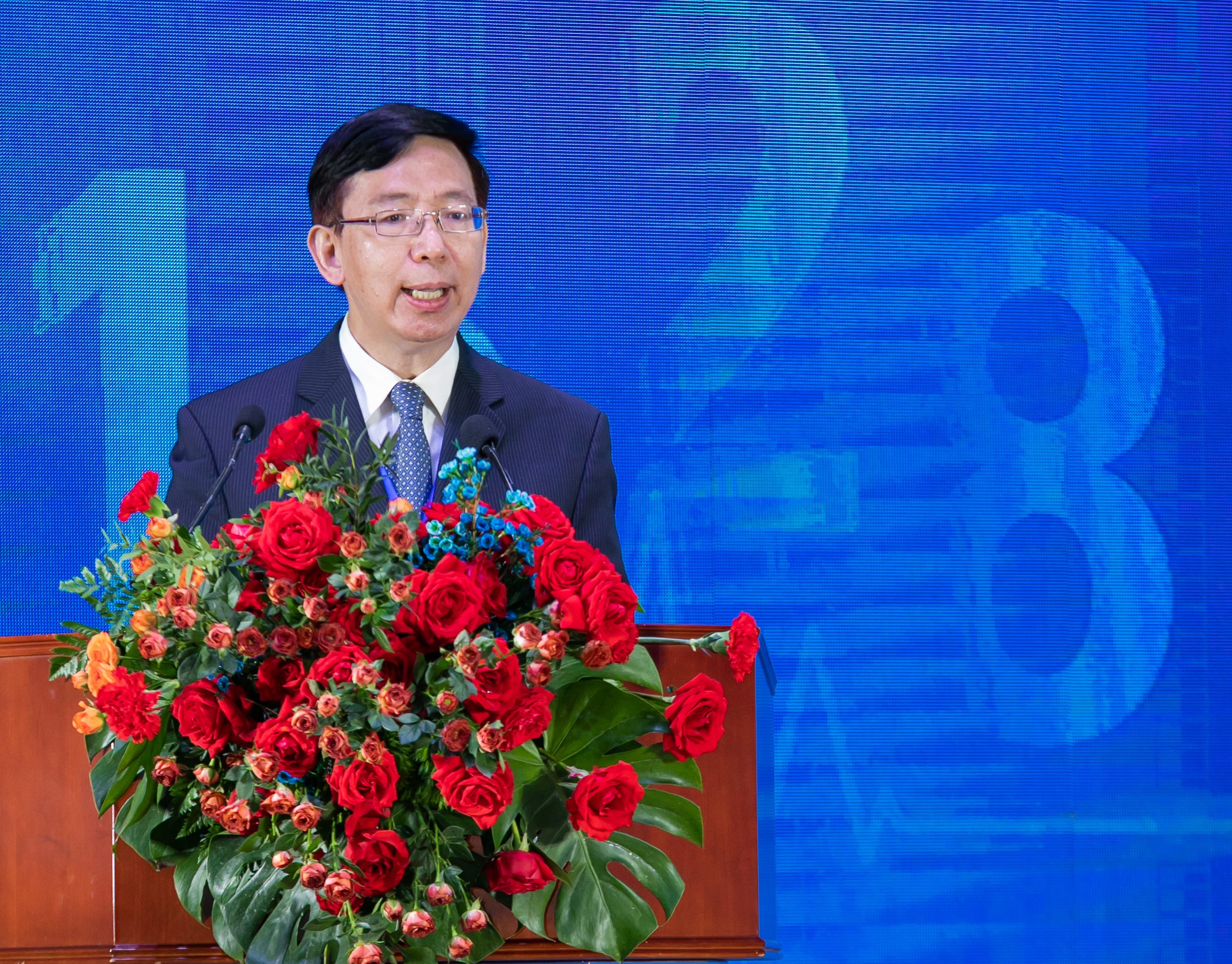 副校长、一附院院长刘章锁作了题为《传承历史,继往开来,筑梦新时代,再创新辉煌》的报告,从“弘医尚道、辉煌历程,三强熔铸、融合发展,砥砺奋进、逐梦一流”三个部分介绍了学校医学教育的历史、现状及展望。