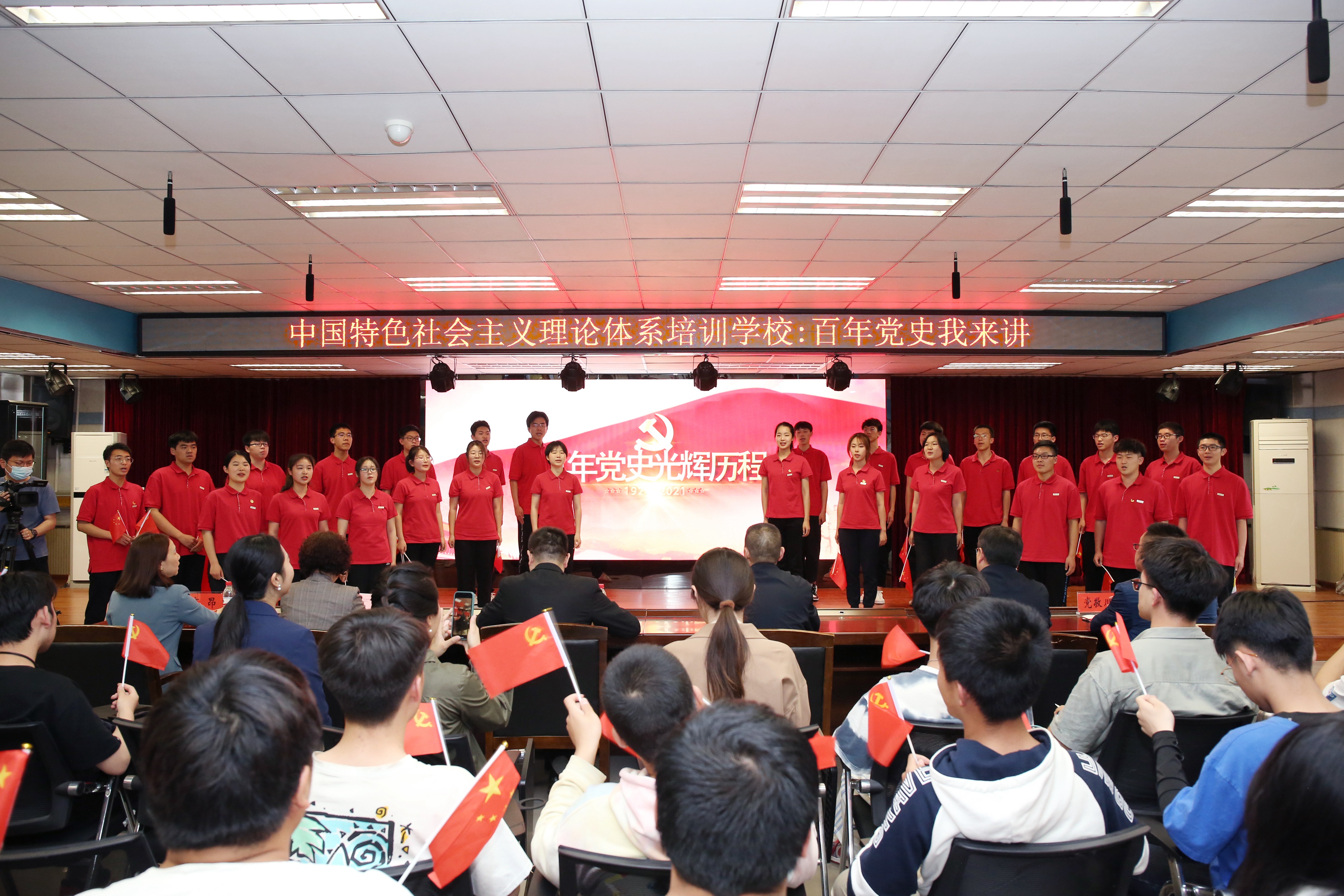在学员们“没有共产党就没有新中国”的激昂歌声中,活动正式拉开序幕。现场播放了由学员自发编创的《百年党史光辉历程》视频。