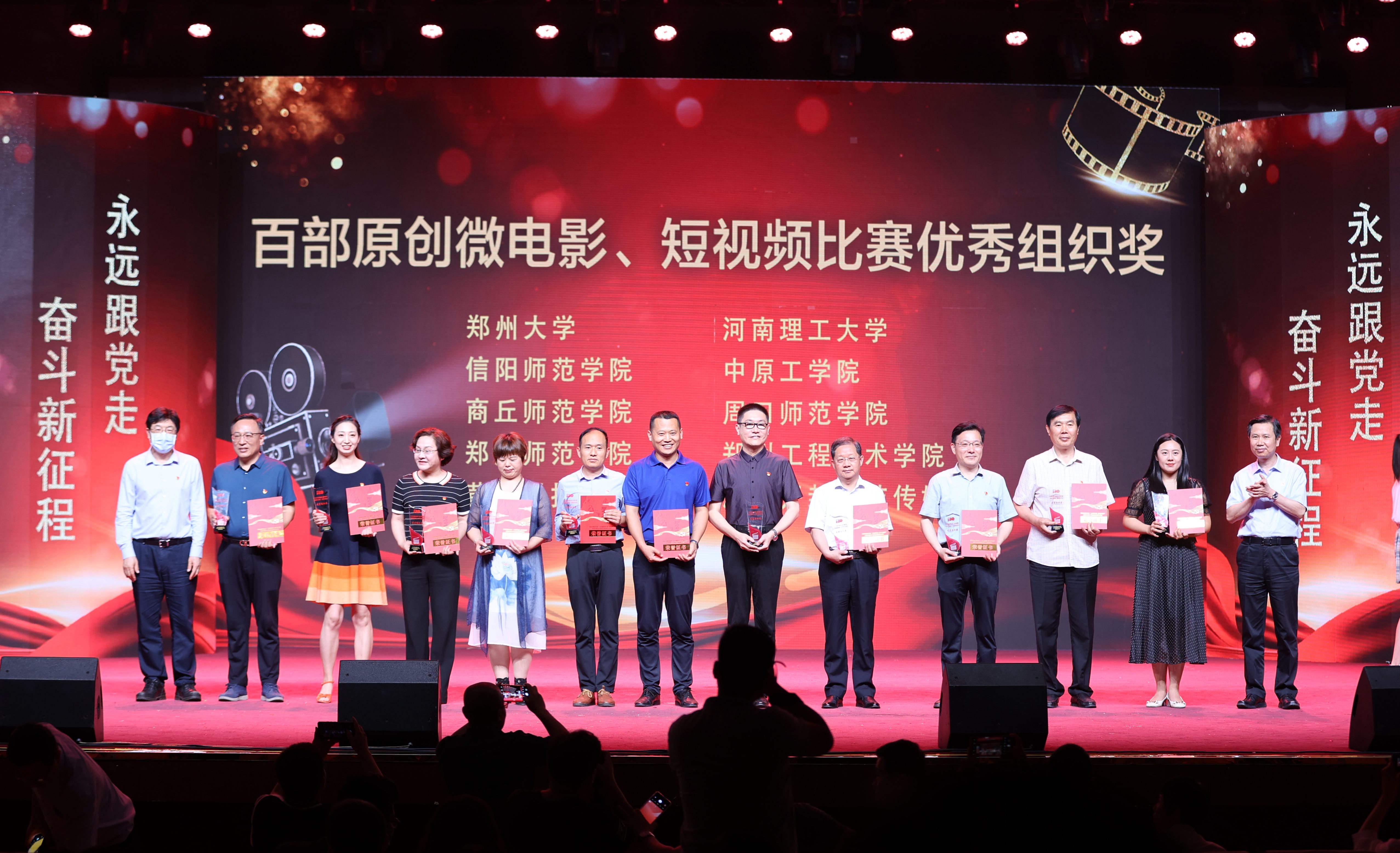 此次活动中精选“100部电影讲课堂”“红动中原跨越时空的思政课”系列活动中的优秀获奖作品,经过精心包装设计集中展演。“100部电影进课堂”活动自4月1日启动以来,征集并公布了100部经典电影目录,在此基础上,78所高校报送了1022部红色经典电影剪辑作品,60余所高校报送了462部原创短视频及微电影作品。其中新闻与传播学院报送的红色经典电影剪辑作品《永不消逝的电波》、原创短视频《秀美郝堂—茶香里的婉约》分别荣获该类别一等奖。此外,在“红动中原跨越时空的思政课”河南省高校学生参演革命电影微视频展播活动中,马克思主义学院选送的《血战湘江》荣获该类别最佳思政点评奖。必赢76net线路官网还荣获“百部经典红色电影剪辑比赛”和“百部原创微电影、短视频比赛”优秀组织单位,新闻与传播学院宗俊伟老师荣获优秀指导教师奖。与会领导分别为获奖单位代表颁奖。