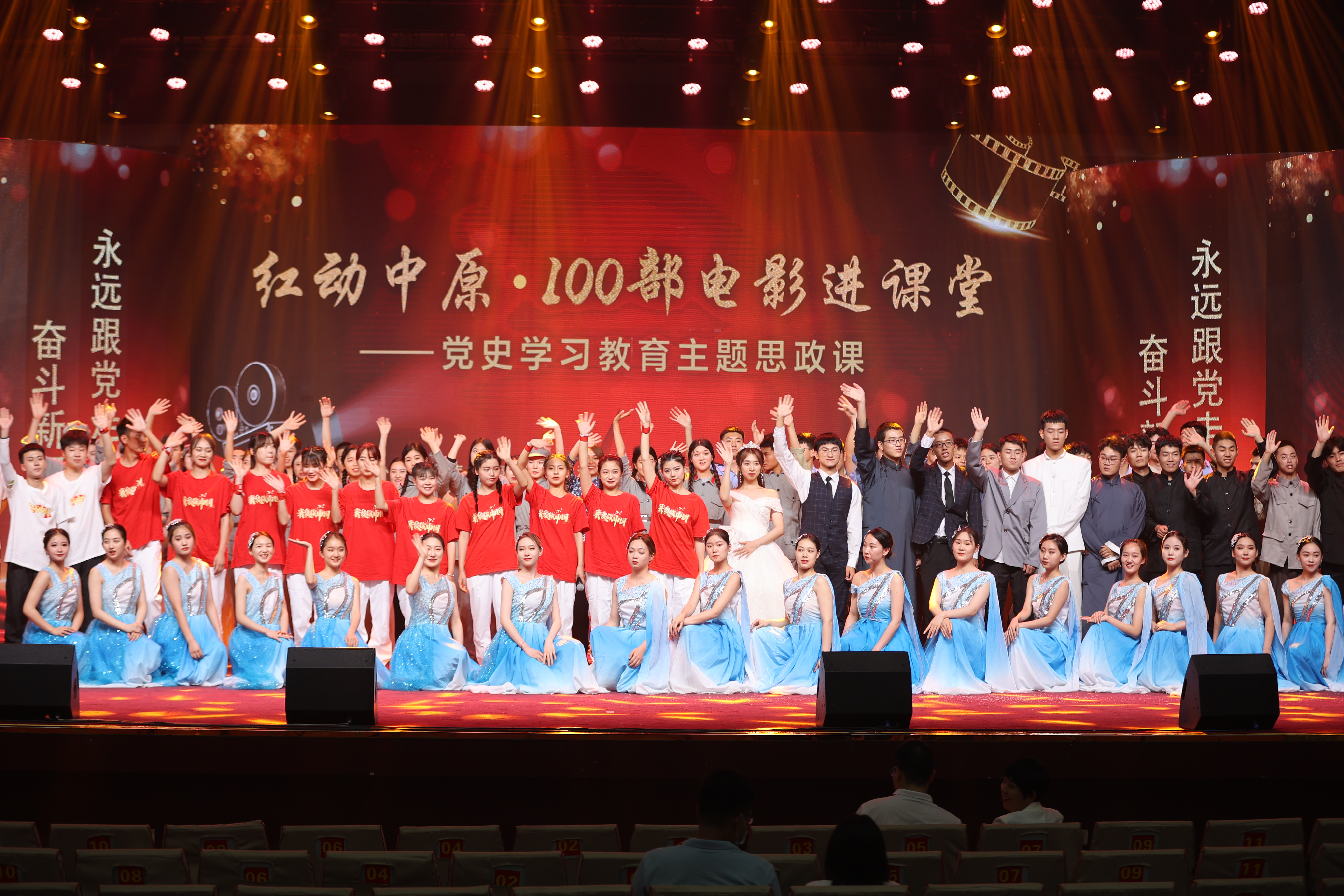 在这堂特殊的思政课堂上,青年大学生们通过红色经典电影演绎、歌曲舞蹈、红色电影剪辑、原创短视频等方式,带领师生追寻革命记忆,传承红色基因,让党史学习教育更接地气,更深入人心,成为大学生最喜爱的“魅力思政课堂”。一幕幕情景剧、一部部红色电影、一段段歌舞结合党史学习教育呈现出多种艺术表达形式,用青春视角走进红色记忆,激励广大师生以史为镜、以史明志,知史爱党、知史爱国,从而让党史学习教育、庆祝建党百年、百部红色经典电影欣赏与思政课有机融合,真正做到活学活用、入脑入心。台上同学们深情演绎红色经典,周荣方老师还原历史娓娓道来,台下500多名师生聚精会神沉浸其中,并通过网络进行直播,全省高校师生全程收听观看。这是全省高校教师牢记初心使命、落实立德树人任务、创新思政育人渠道的又一次成功尝试,也是今年以来全省教育系统开展“永远跟党走 奋斗新征程”庆祝建党100周年系列活动的重要组成部分。