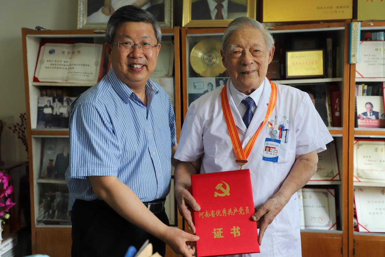 省政协副主席、校长刘炯天为张效房教授颁发河南省优秀共产党员奖章及证书