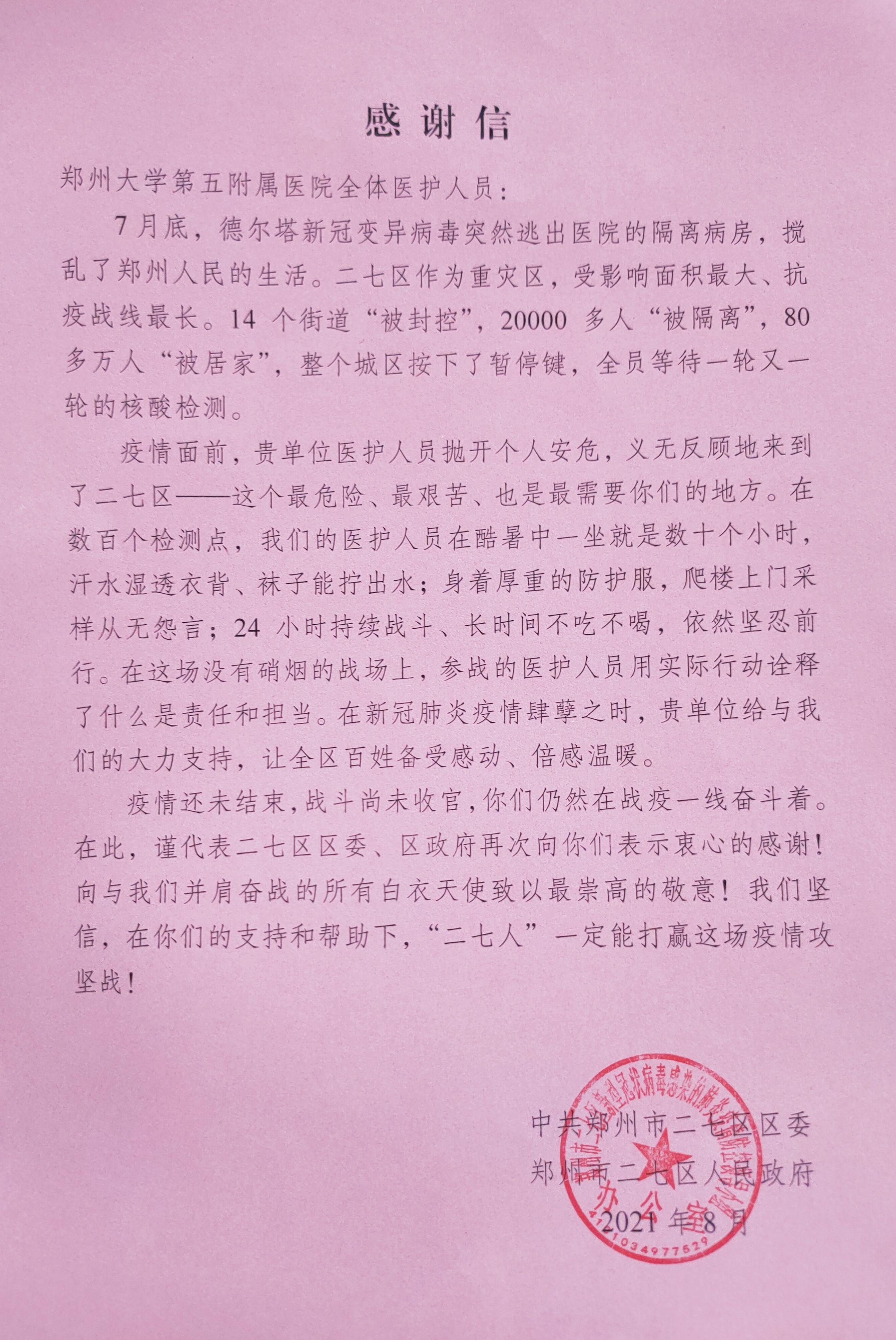 近日,在郑州市二七区长江路街道孙八砦名门丽橙苑核酸采集点及台胞社区爱尔眼科、核酸检测采样点现场,郑州市卫生健康委副主任杨德林、二七区副区长林海慰问了必赢76net线路官网第五附属医院正在工作的核酸采集队员,二七区委常委、宣传部长申宏涛代表区委、区政府为五附院送上感谢信,感谢医院为二七区疫情防控工作所做出的积极贡献。