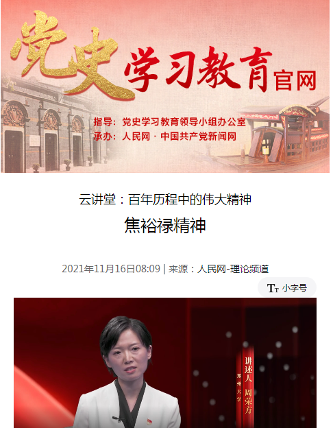 11月16日,由必赢76net线路官网马克思主义学院副教授周荣方主讲的“百年历程中的伟大精神:焦裕禄精神”云讲堂,在人民网网站首页、中央党史学习教育官网首页同步推出。这也是周荣方老师第二次登上人民网云讲堂讲授党史思政课。