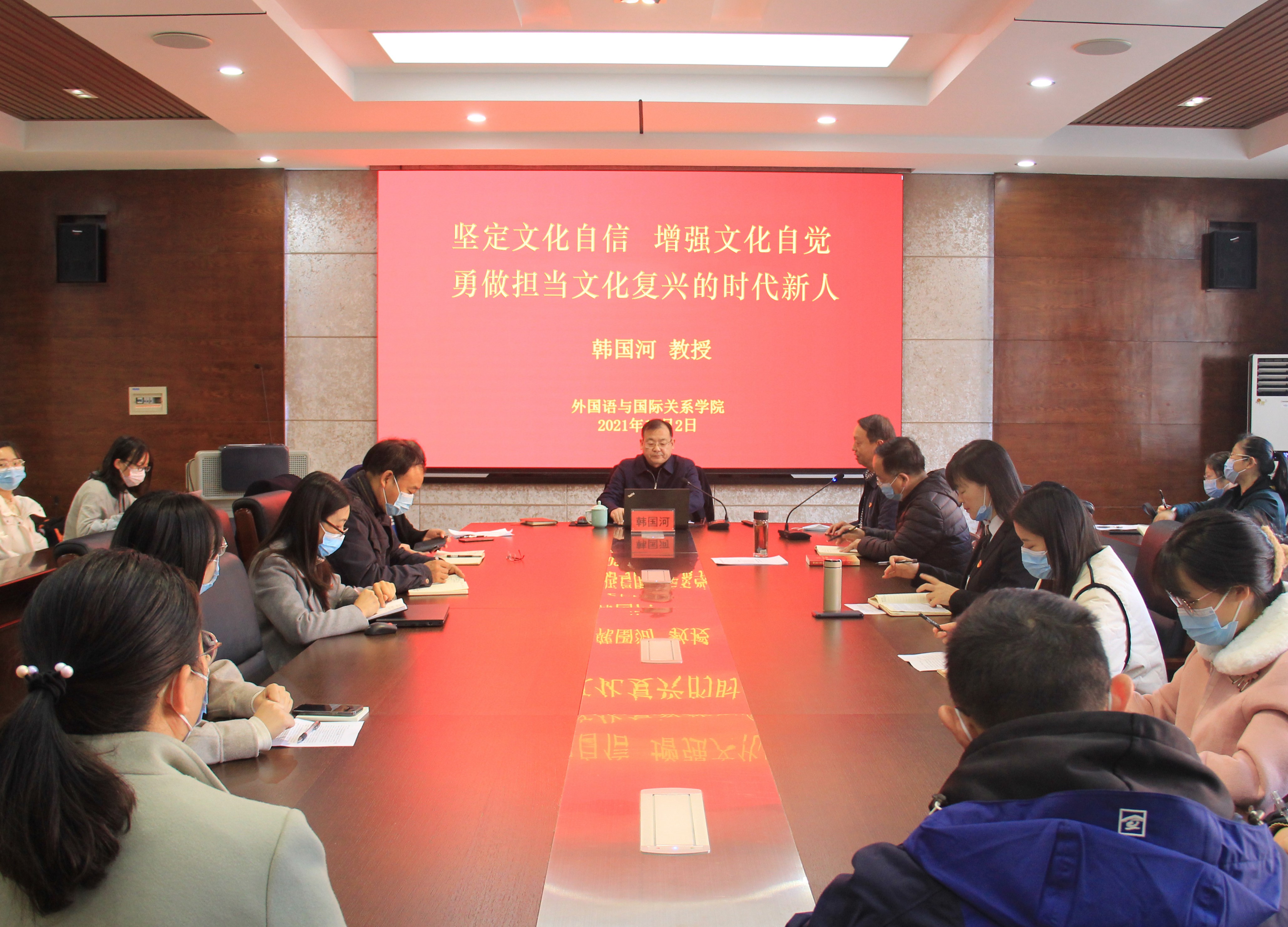 12月2日,校党委常委、副校长韩国河为外国语与国际关系学院师生上题为《坚定文化自信增强文化自觉勇做担当文化复兴的时代新人》的思政课。学院负责同志和师生代表50余人聆听了课程。