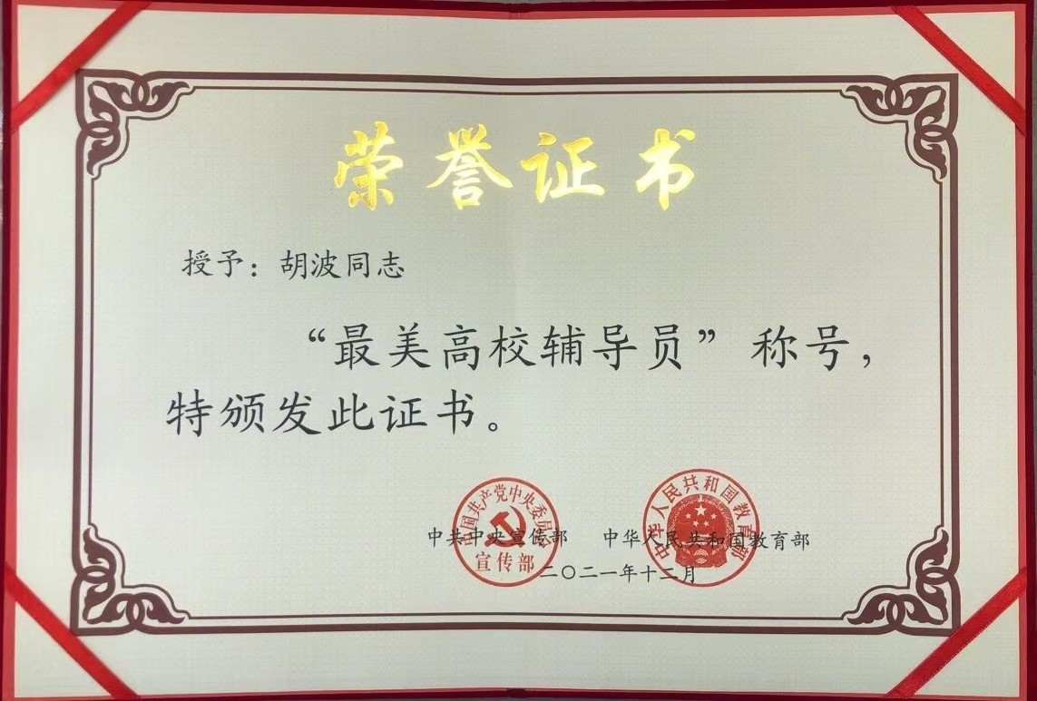 胡波从事辅导员工作以来,先后荣获全国辅导员素质能力大赛一等奖、河南省高校辅导员年度人物,主持教育部人文社会科学研究一般项目(高校辅导员研究专项)、河南省高校思想政治工作精品项目。2019年3月18日,作为河南省高校辅导员唯一代表,胡波参加了由习近平总书记主持召开的学校思想政治理论课教师座谈会,受到总书记亲切接见。胡波在日常工作中,始终坚守一线,苦练内功。探索谈心谈话“五步法”,力求用真心将情理入脑入心;创新工作形式,成立学党史“青年百人团”,致敬“先辈同龄人”,用青春方式讲好信仰故事;善于把握育人契机,身处抗洪战“疫”重灾区,用好现实素材,上好大思政课;组建学生理论宣讲实践团,引导学生走出课本、走进乡村,把思政小课堂与社会大课堂结合起来,在重大战略中贡献青年力量。受聘为全省高校优秀辅导员党的十九大精神校园巡讲团、全省教育系统学习贯彻落实习近平总书记教师节重要寄语精神报告会宣讲团成员,用身体力行践行党的创新理论。