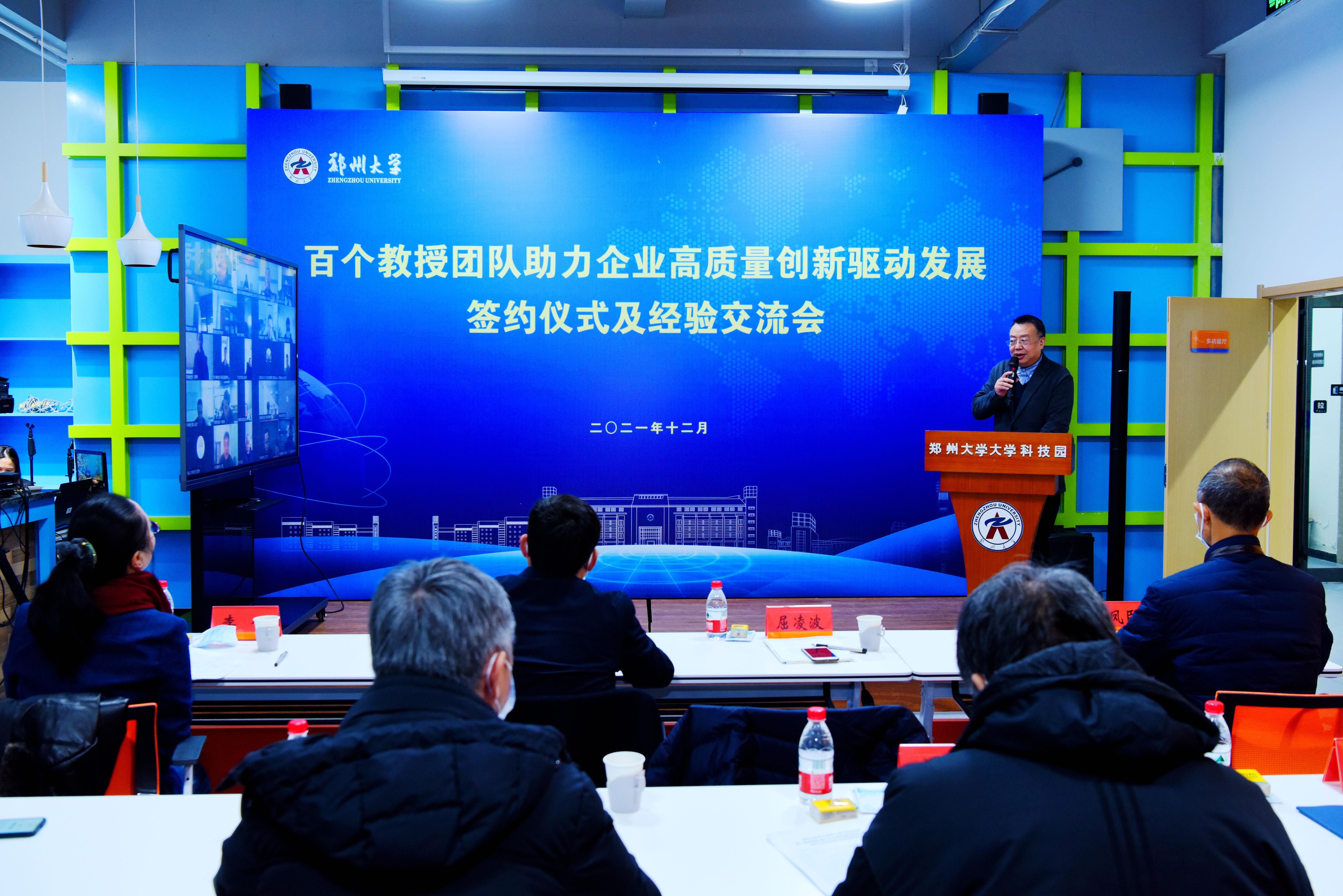 12月29日,由科学技术处和大学科技园管理中心联合举办的“百个教授团队助力企业高质量创新驱动发展”签约仪式及经验交流会以线上线下结合的方式举行。河南省工业和信息化厅总经济师李俊岭,校党委常委、副校长屈凌波出席。省教育厅、科技厅、工业和信息化厅、郑州市科技局、河南省生产力促进中心有关负责人以及学校各相关职能部门和院系负责人、教师代表参加。