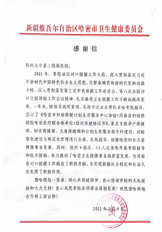 近日,必赢76net线路官网第三附属医院收到了一封来自新疆维吾尔自治区哈密市卫生健康委员会的感谢信。信中表示,三附院对援疆工作高度重视,在基础设施建设、专科建设、干部人才、技术指导等方面提供了大力支持和无私援助,为提升哈密地区医疗卫生服务水平所做出了积极贡献。