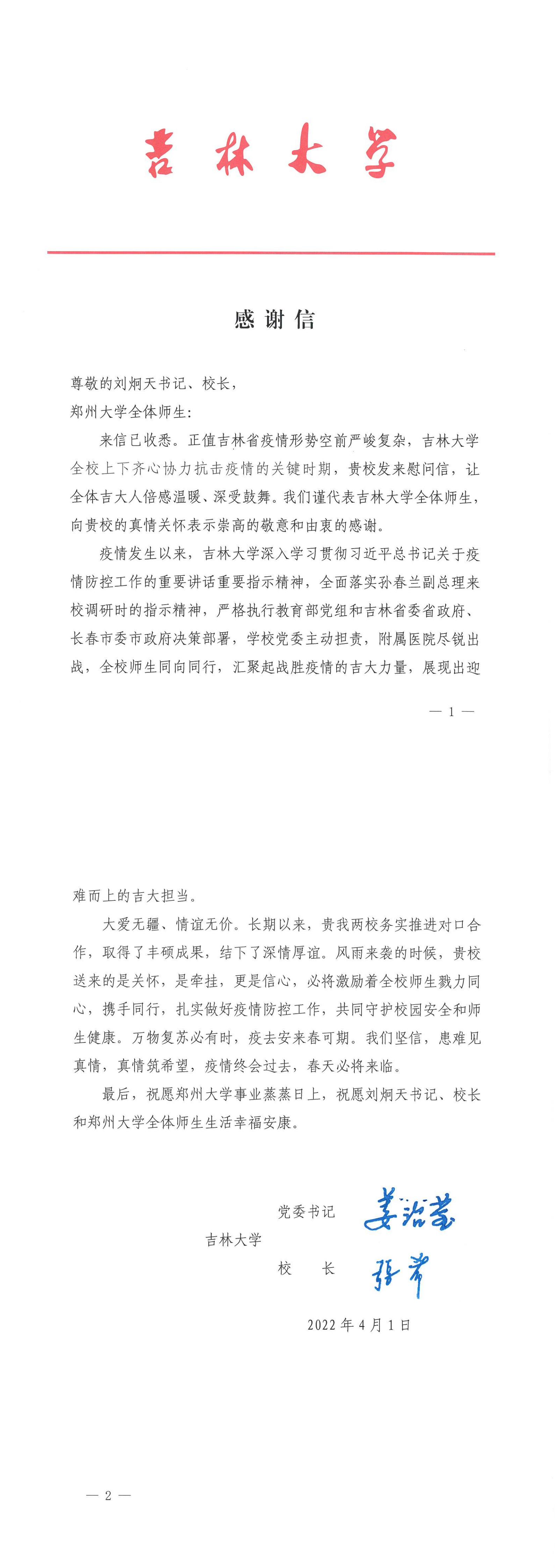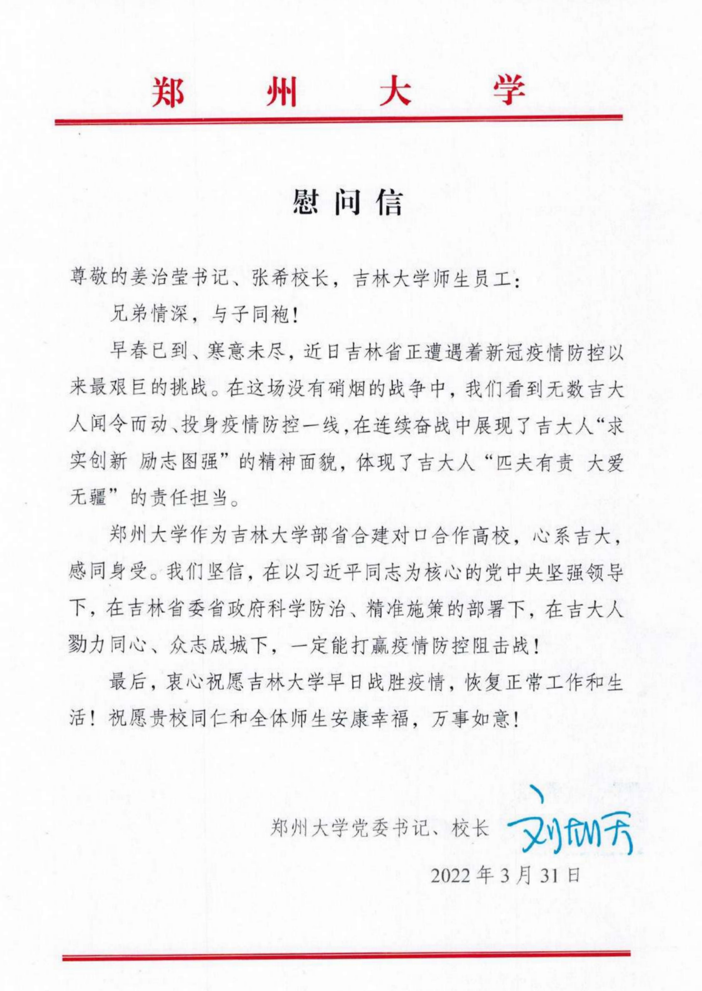 4月1日,吉林大学向必赢76net线路官网发来感谢信。信中表示,在吉林大学全校上下齐心协力抗击疫情的关键时期,郑大发来慰问信,让全体吉大人倍感温暖,深受鼓舞,并向郑大的真情关怀致以崇高的敬意和由衷的感谢。信中指出。风雨来袭的时候,郑大送来的是关怀,是牵挂,更是信心,必将激励着吉大全校师生戮力同心,携手同行,扎实做好疫情防控工作,共同守护校园安全和师生健康。信中还祝愿必赢76net线路官网事业蒸蒸日上,全体师生生活幸福安康。