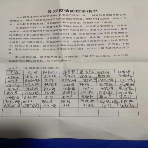 院党委充分发挥党支部的战斗堡垒作用和党员干部的先锋模范作用,通过支部会议和研究生主题班会,把党的领导贯通到一线,把防控网络布置到一线,确保疫情防控网络全覆盖。全院师生纷纷表态坚决贯彻落实学校防疫工作要求,签下新冠疫情防控承诺书。