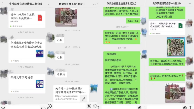 疫情发生后,数学与统计学院迅速集结,全力做好疫情防控的各项工作,全方位保障师生的生命安全和身体健康。党政班子第一时间部署,全面动员,快速行动,多名同志积极主动值岗,24小时坚守岗位。坚持网格化管理、织牢疫情防控防线,并在原有工作基础上加强系统化推进、常态化提醒和教育,保证健康日报及时反馈、核酸检测全员覆盖、师生情况全面了解、突发问题迅捷解决,实现了学院疫情防控工作责任到岗、到人的精准管控,从严落实疫情防控措施,为师生健康保驾护航。同时,结合疫情防控相关要求和变化,向全院师生提醒并发出“教职工家校两点一线,学生非必要不外出”“严格遵守防疫政策,及时主动进行信息报送”“争做先锋模范,助力疫情防控”等倡议,营造“携手抗疫,共克时艰”的良好氛围。