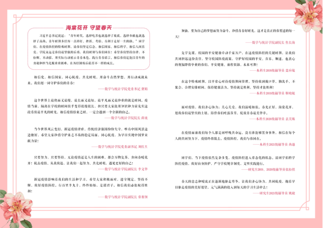 学院坚持以学生为中心,用爱心互通的实际行动将关心关怀学生、做好学生服务落实在学生的需求上、温暖在学生的心坎里。“倾听心声”理解学生,学院以党政班子召开学生代表、学生党员座谈会和辅导员开展学生干部会议相结合的形式,构建多层次、立体化沟通交流体系。学院班子成员分时段召开多场学生座谈会,学生代表覆盖本科、研究生各年级,倾听学生心声,围绕近期学校相关管理及学生生活学习情况交流意见;呼应学生关切,召开学院党政班子紧急碰头会研判座谈会上收集到的问题并制定措施。辅导员以线上线下相结合的形式组织召开学生干部会议,了解学生思想动态,布置疫情防控工作,指导各班组织开展“疫情防控”主题班会。“传递爱心”关怀学生,学院举行“海棠花开 守望春天”爱心关怀礼包发放活动,党政班子和各年级辅导员书写抗疫鼓励寄语,同时为全院1238名学生准备爱心礼包,为学生送去温暖,用心守护学生。“用爱守护”服务学生,学院积极主动开展考研复试学生服务,第一时间、逐一询问做好复试学生信息统计,协调、安排学院办公室、教授工作室保障学生复试场地,积极为学生采购复试所需器材并提前做好技术调试,以主动关注和全力保障的实际行动,多措并举解决学生线上考研复试遇到的实际困难,解除学生的后顾之忧,为学生搭建圆梦桥梁。全院上下形成“一心为学生,携手办实事”的良好氛围,在一次次沟通交流中、一件件解决实际问题的行动中,构筑疫情防控关键时刻学生身心健康的爱心通道,绘制助力学生成长成才的发展图。