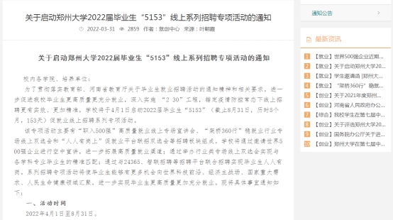 为进一步促进毕业生更高质量更充分就业,大学生就业创业指导服务中心深入实施“2 30”工程,锚定疫情防控常态下线上招聘更有实效、更加精准,于4月1日启动2022届毕业生“5153”(截止8月31日,历时5个月,153天)促就业线上招聘系列专项活动。