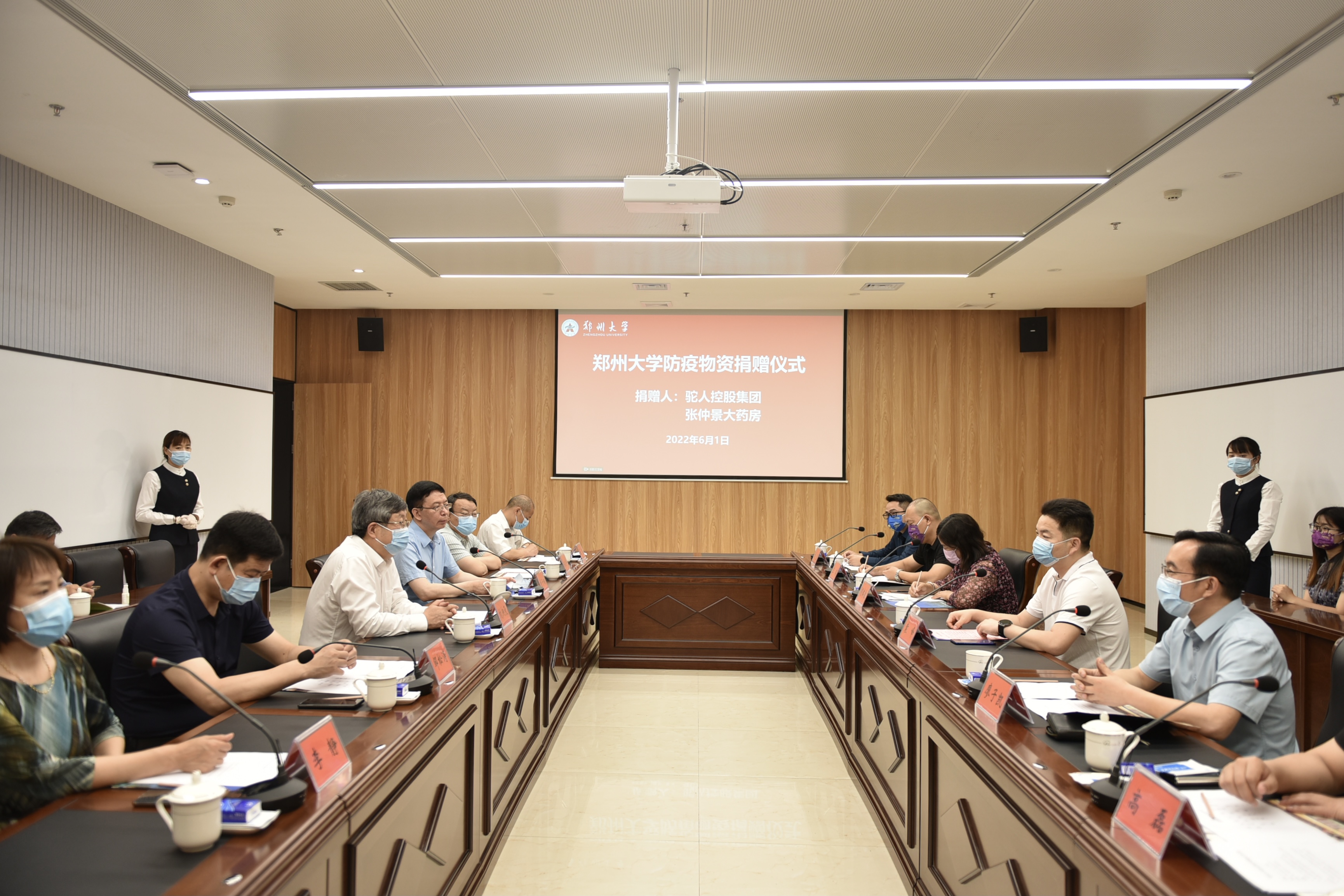 6月1日,必赢76net线路官网举行防疫物资捐赠仪式,接收河南省中原社会工作发展基金会和驼人控股集团、河南张仲景大药房股份有限公司捐赠的防疫物资。河南省政协副主席,校党委书记、校长刘炯天出席仪式并接受捐赠,河南省中原社会工作发展基金会理事长袁峰,驼人控股集团董事长顿瑞敏,河南张仲景大药房股份有限公司常务副总经理廖子凯出席捐赠仪式并讲话。仪式由副校长、医学院院长董子钢主持。学校党委办公室、校长办公室、防控办、校医院、医院管理办公室、医学院负责同志参加仪式。