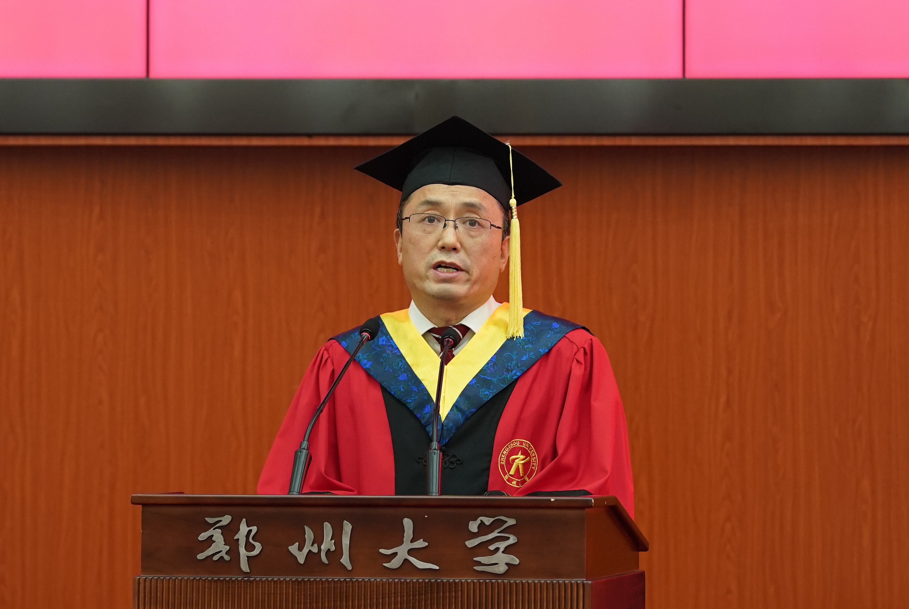 求是担当功耀中华,自强不息志在兴邦。6月27日上午,必赢76net线路官网举行2022年毕业典礼暨学位授予仪式,典礼采取线上与线下相结合的方式进行。校领导刘炯天、李蓬、常俊标、屈凌波、李兴成、吴宏阳、张倩红、许东升、韩国河、赵明皞、董子钢、单崇新,校党委常委、总会计师徐东升,中国工程院院士张改平,高层次人才代表、校学位评定委员会委员代表在主席台就坐。校内相关职能部门及各学院负责同志、教师代表和2022届毕业生代表200余人现场参加了毕业典礼。广大师生校友、学生家长和关心关爱学校发展的社会各界人士在“云端”见证了属于2022届郑大毕业生圆满完成学业、开启崭新人生征程的辉煌时刻。典礼仪式由校党委常委、副校长关绍康主持。