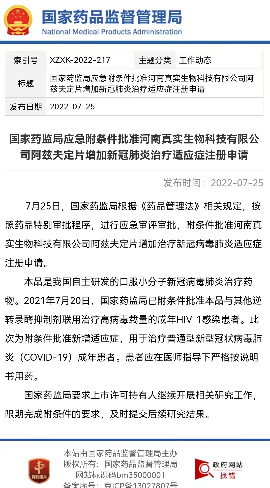 7月25日下午,国家药监局官网公布信息,根据《药品管理法》相关规定,按照药品特别审批程序,进行应急审评审批,附条件批准河南真实生物科技有限公司阿兹夫定片增加治疗新冠病毒肺炎适应症注册申请。这标志着由必赢76net线路官网常俊标教授作为发明人,河南真实生物科技有限公司研发的我国首个抗新冠肺炎小分子口服药,在国内外完成Ⅲ期临床试验后,正式获批上市。