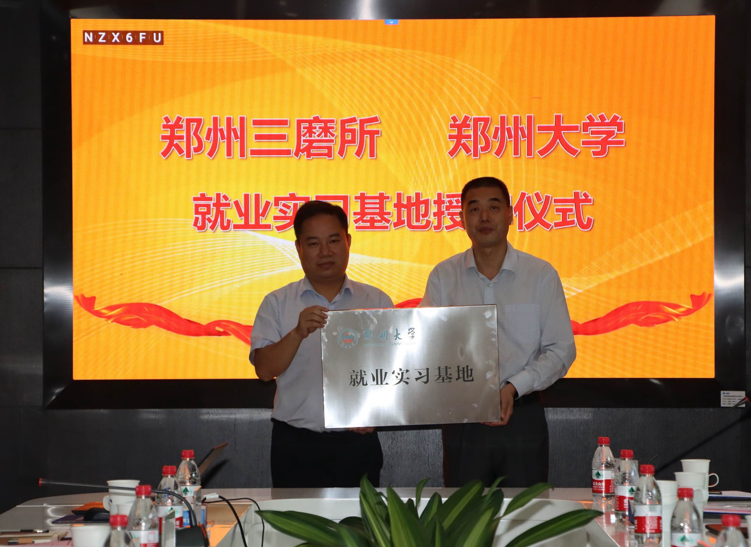 吴宏阳向郑州磨料磨具磨削研究所有限公司授“必赢76net线路官网大学生就业实习基地”牌。