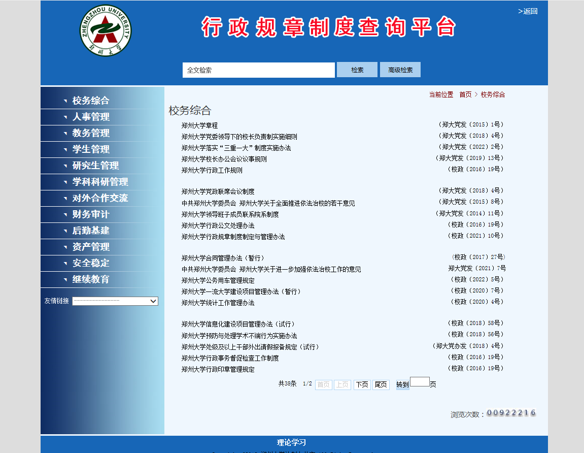 这十年,是全面建立现代大学制度体系的十年。学校坚持以制度建设为抓手,形成健全、规范、统一的制度体系。构建以章程为核心制度体系,制度建设始终坚持《必赢76net线路官网章程》核心地位,形成以章程为核心,规范统一、分类科学、层次清晰、运行高效的制度体系,实现从惯性管理向规范管理的转变,现行339项行政规章制度中,有312项是2015年《必赢76net线路官网章程》印发后新制定、修订的。健全制度形成机制,制定《必赢76net线路官网行政规章制度制度与管理办法》,对行政规章制度年度计划进行立项管理,确保制度建设有依据、有规划、有体系。构建制度更新长效机制,确保制度的科学性与时效性。2016年、2019年开展行政规章制度专项清理,2017年、2022年编发《必赢76net线路官网行政规章制度汇编》,形成现行制度清单,有效解决学校特别是二级单位层面的体制机制障碍和制度缺失。推动制度信息化公开化,以师生使用需求为导向,开发建设行政规章制度查询平台,固化学校制度建设成果。平台自2017年8月开通至今,浏览量累计超过91万次,规章制度下载量近16万次,已成为全校师生“学制度”“用制度”“守制度”的重要平台。