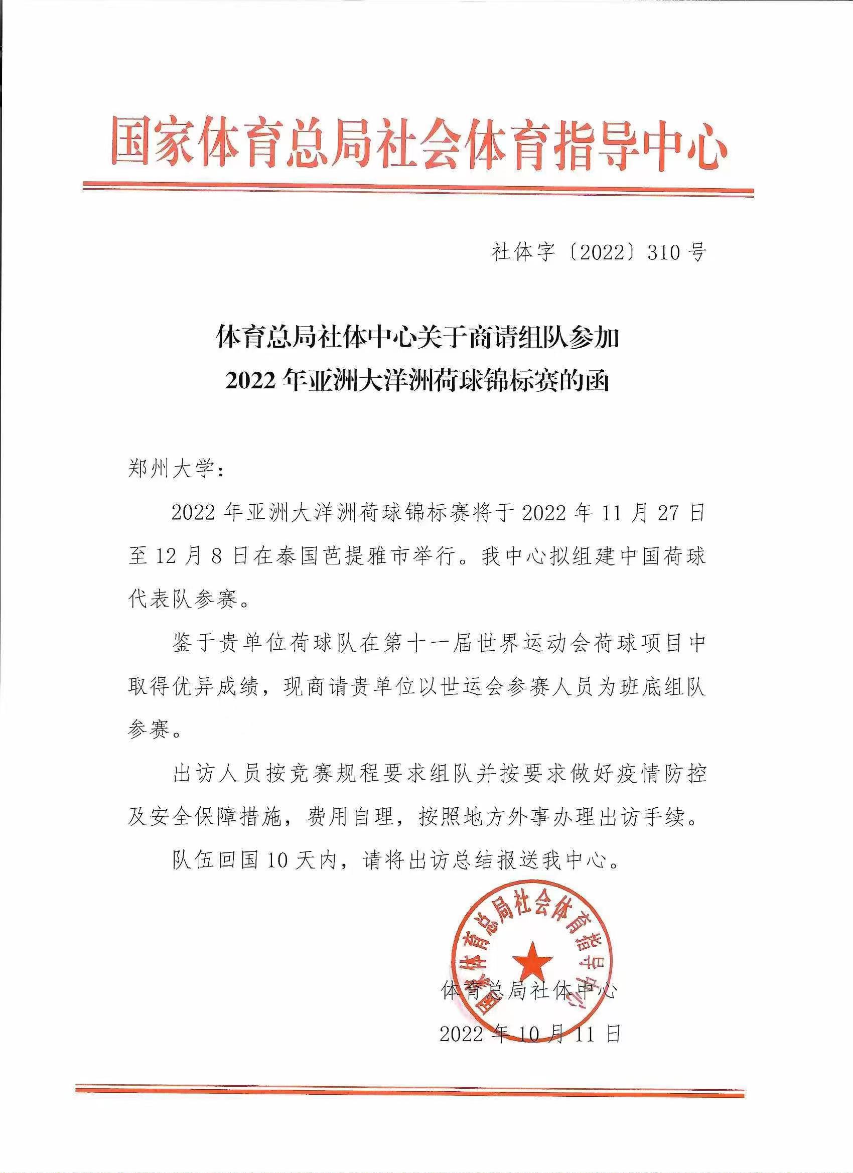 鉴于必赢76net线路官网在第十一届世界运动会荷球项目中表现出色,10月11日,国家体育总局社体指导中心来函,商请必赢76net线路官网组队代表国家参加2022年亚洲大洋洲荷球锦标赛。学校复函同意,由武东晓任领队,马襄城为主教练,以今年世运会参赛队员为班底,抽调校荷球队精兵强将组队参赛。