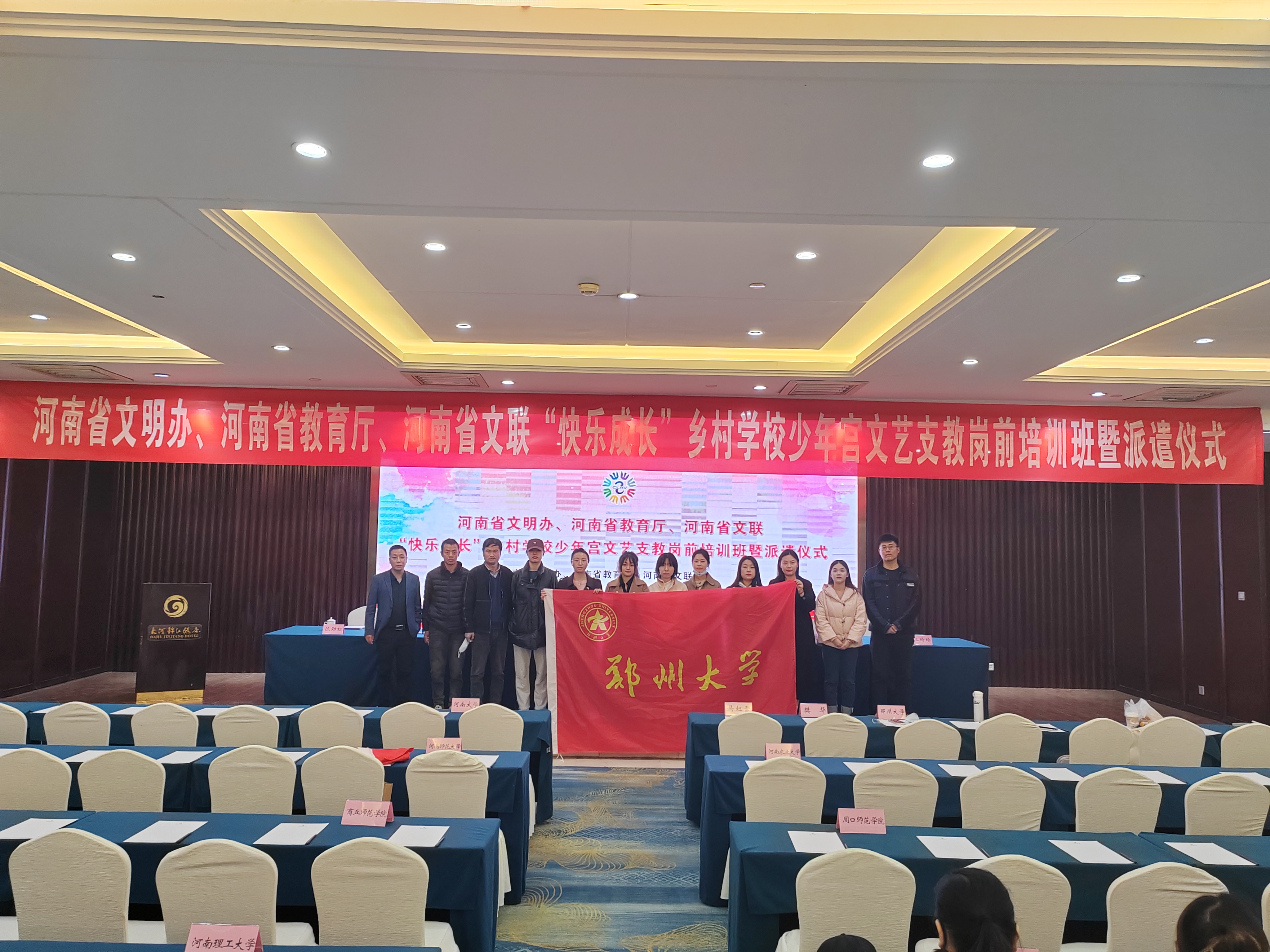 近日,由河南省文明办、河南省教育厅、河南省文联主办的“快乐成长”乡村学校少年宫文艺支教岗前培训班暨派遣仪式在郑州市举行。省委宣传部精神文明建设二处处长杨恒智,省文联副主席、省美协主席刘杰,省音乐家协会主席陈静,省书法家协会副主席周斌以及来自必赢76net线路官网等11所高校的139名文艺志愿者参加仪式。