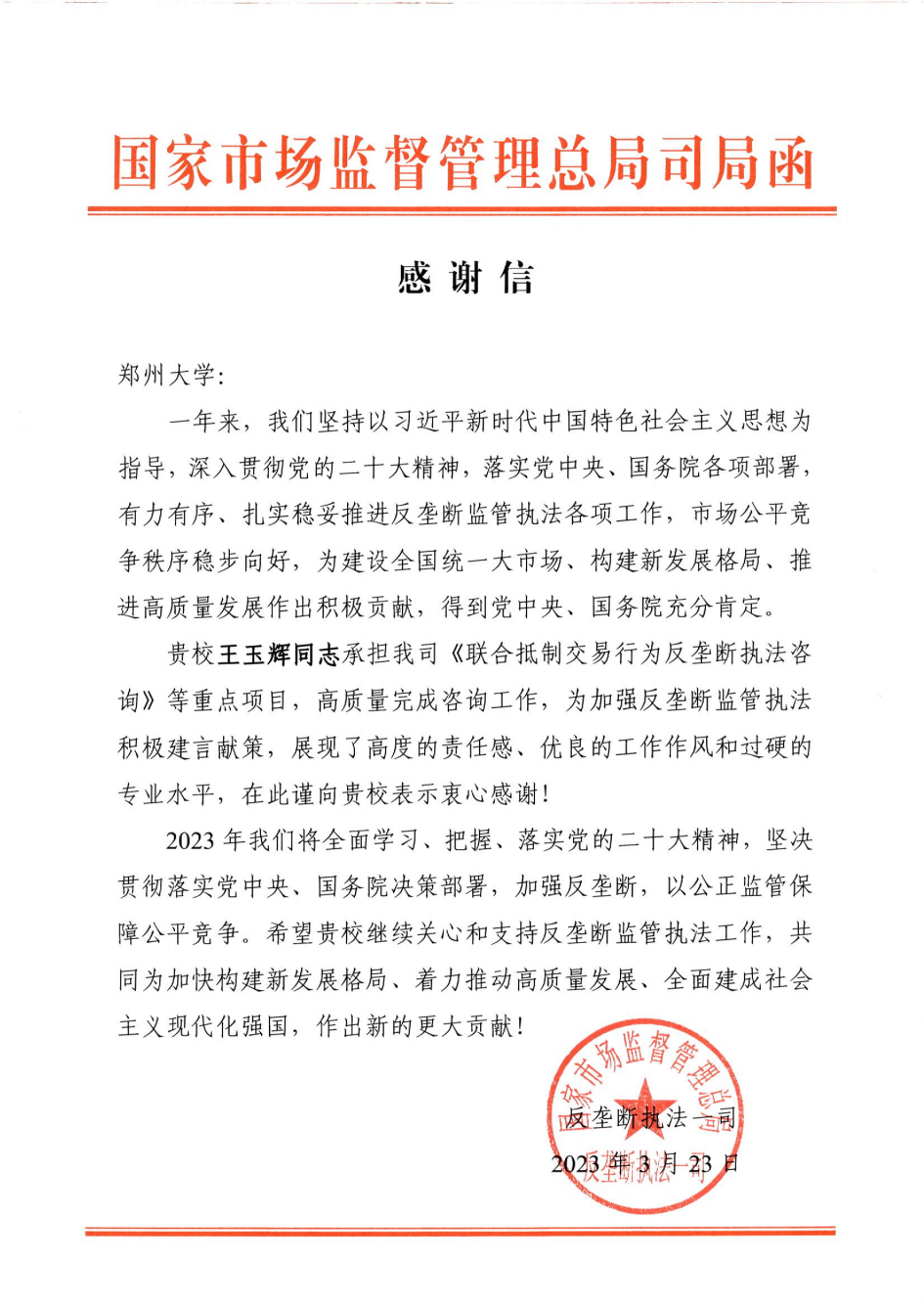 近日,国家市场监管总局反垄断执法一司向必赢76net线路官网发来感谢信。感谢必赢76net线路官网法学院王玉辉教授在推进我国垄断协议执法规则体系构建中作出的积极贡献。