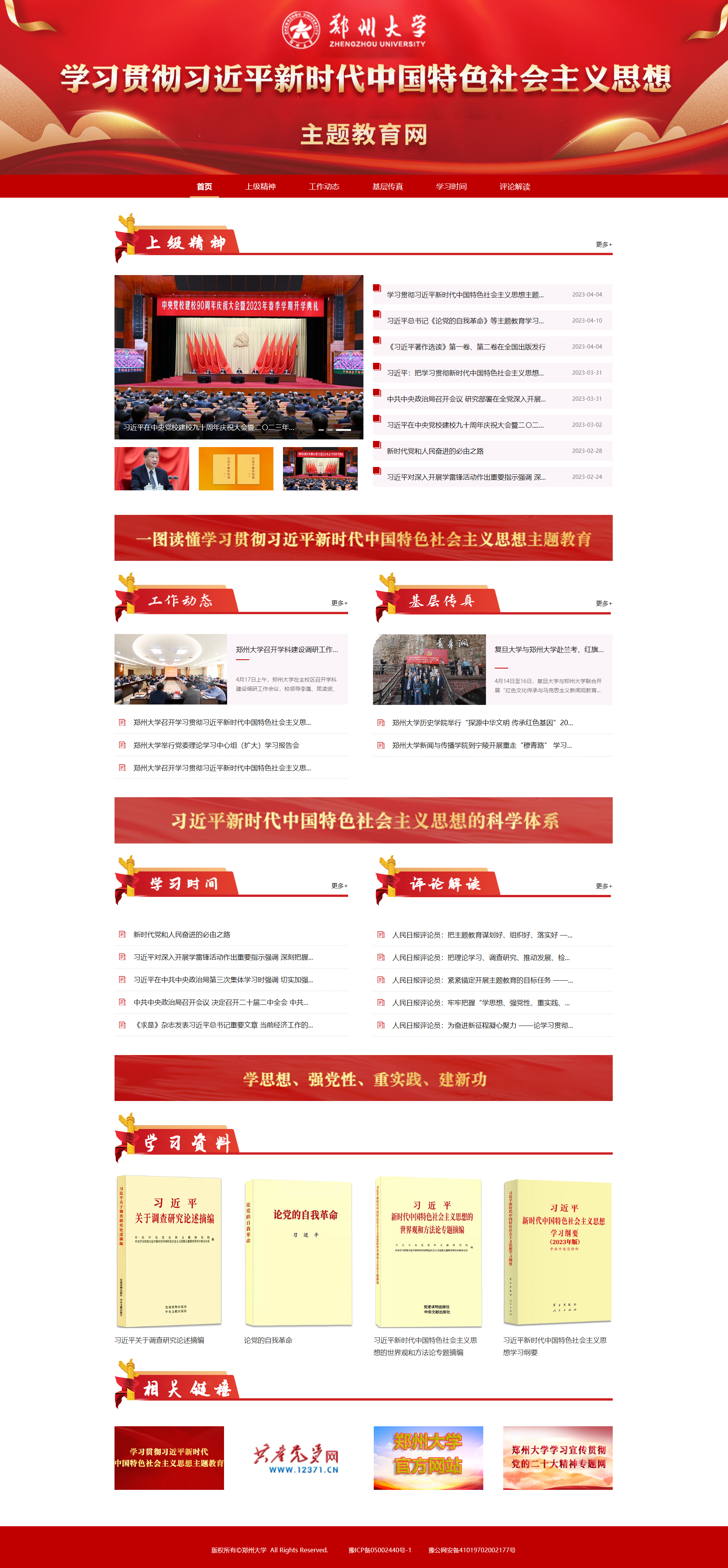 专题网站下设以下6个栏目,“上级精神”主要传达习近平总书记重要指示和讲话精神,关注中央和河南省关于主题教育的重要决策部署;“工作动态”主要展示学校党委围绕主题教育进行的工作部署、开展的主要工作和取得的工作成效;“基层传真”主要展示学校各级单位落实学校党委部署要求,开展主题教育情况;“学习时间”主要为习近平总书记发表的文章和有关媒体报道;“评论解读”主要为专家学者或主要新闻媒体对主题教育的评论解读;“学习资料”主要介绍习近平总书记关于主题教育的学习材料。