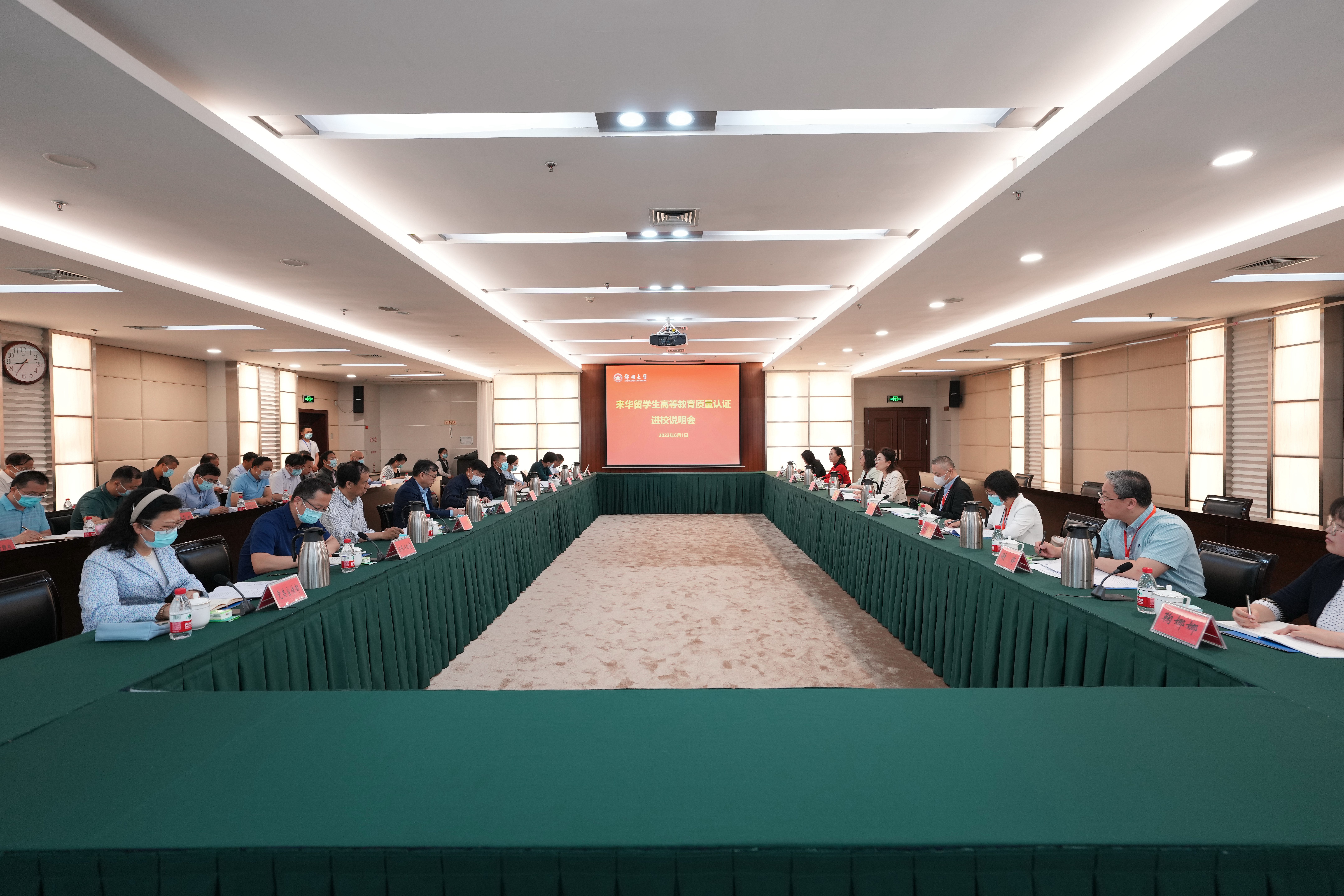 近日,中国教育国际交流协会认证小组对必赢76net线路官网来华留学生高等教育质量再认证实施现场审查。交流协会副秘书长傅博,河南省教育厅二级巡视员、河南省教育国际交流协会会长徐恒振,校党委副书记吴宏阳,党委常委、副校长韩国河出席,学校来华留学生管理和培养相关单位负责人参加了现场审查说明会和初步意见反馈交流会。韩国河主持会议。