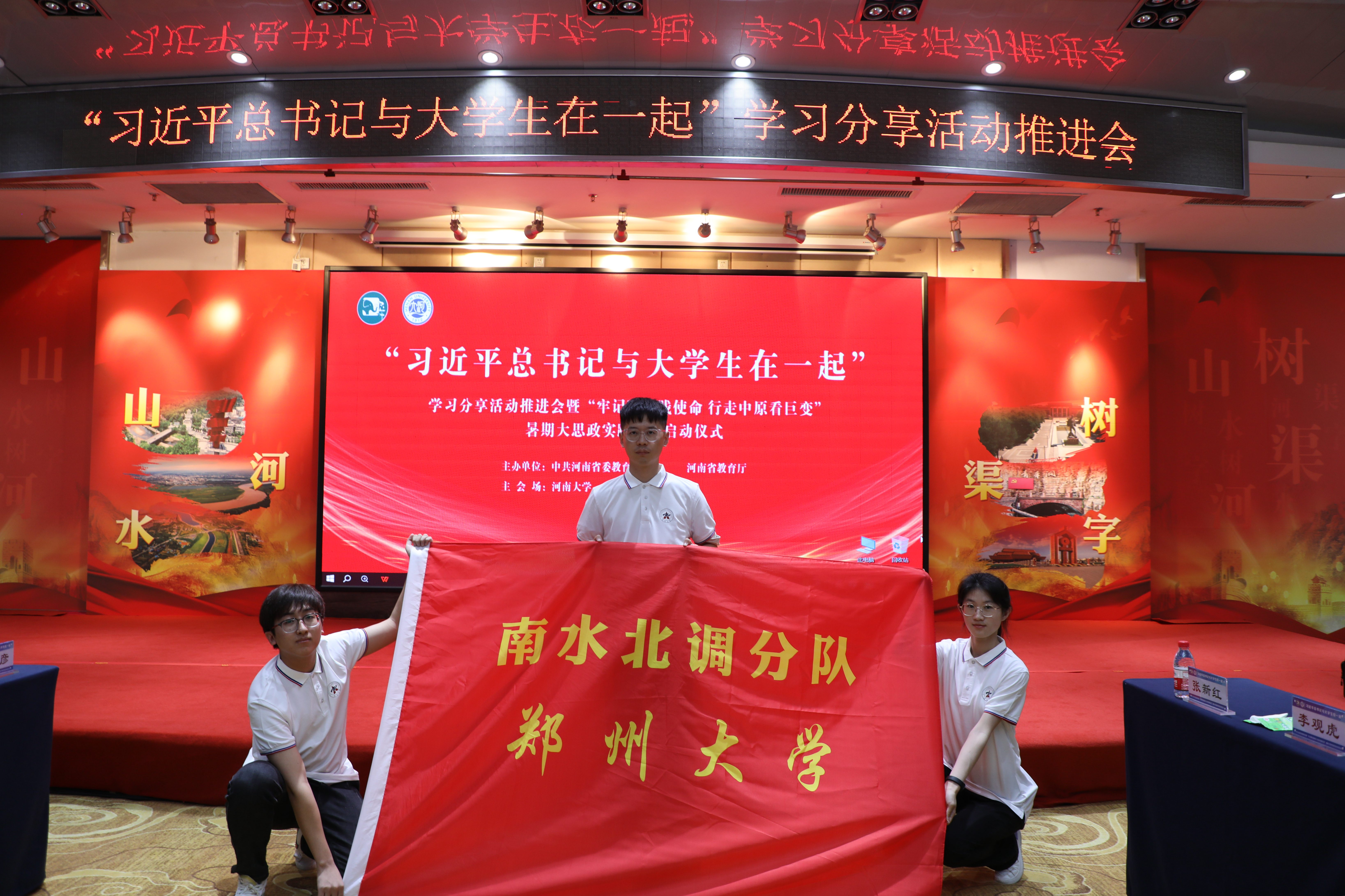 会上,尹洪斌为暑期大思政实践活动代表高校的分队师生代表授旗。校团委南水北调分队负责老师及学生代表上台领旗。