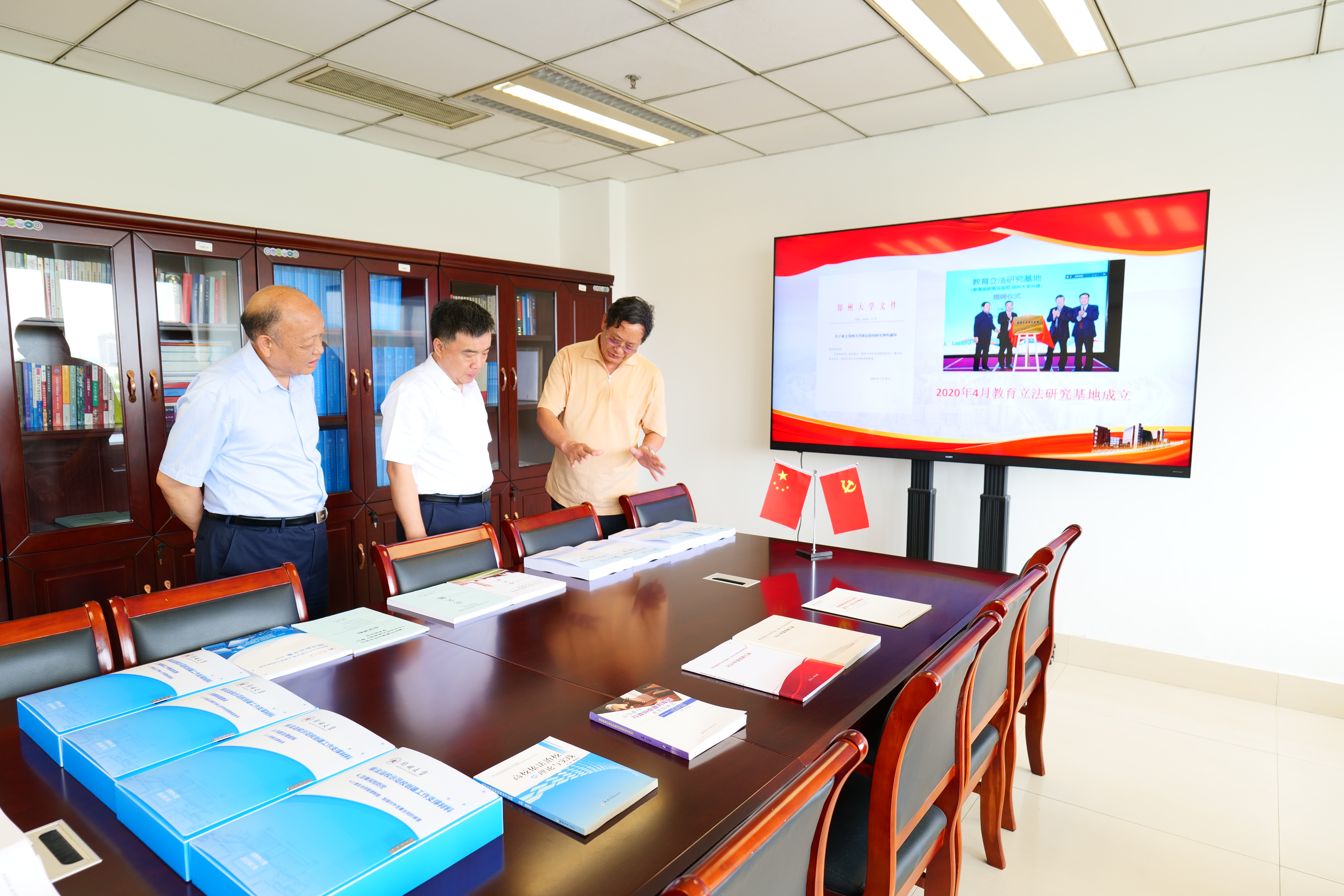 在教育立法研究基地,王大泉听取了负责同志的介绍,对取得的理论和实践成果给予了充分肯定。他强调,立法研究基地建设一是定位要高,发挥学校区位优势和办学特色,将基地打造成高端智库平台,提高咨政建议质量和水平;二是落地要实,紧贴学校一流大学建设实际和改革建设发展需求,积极探索依法治校的新模式新路径,以法治化治理水平的提升推动学校治理体系和治理能力现代化;三是聚焦要准,针对教育实践的重大问题以及教育法治领域的热点难点问题进行系统深入研究,在空白点、重难点上求突破,以高质量的研究成果服务教育法治实践。