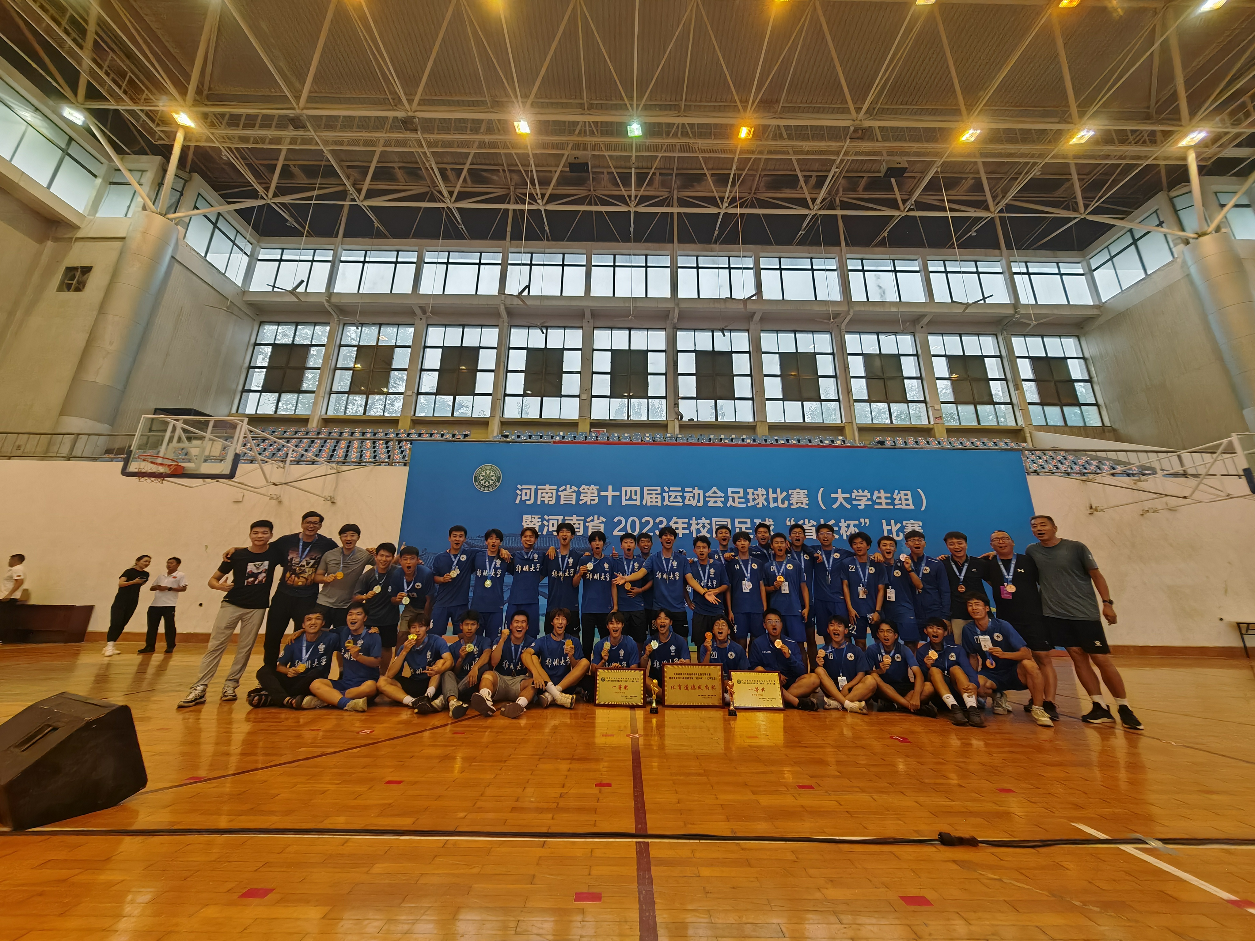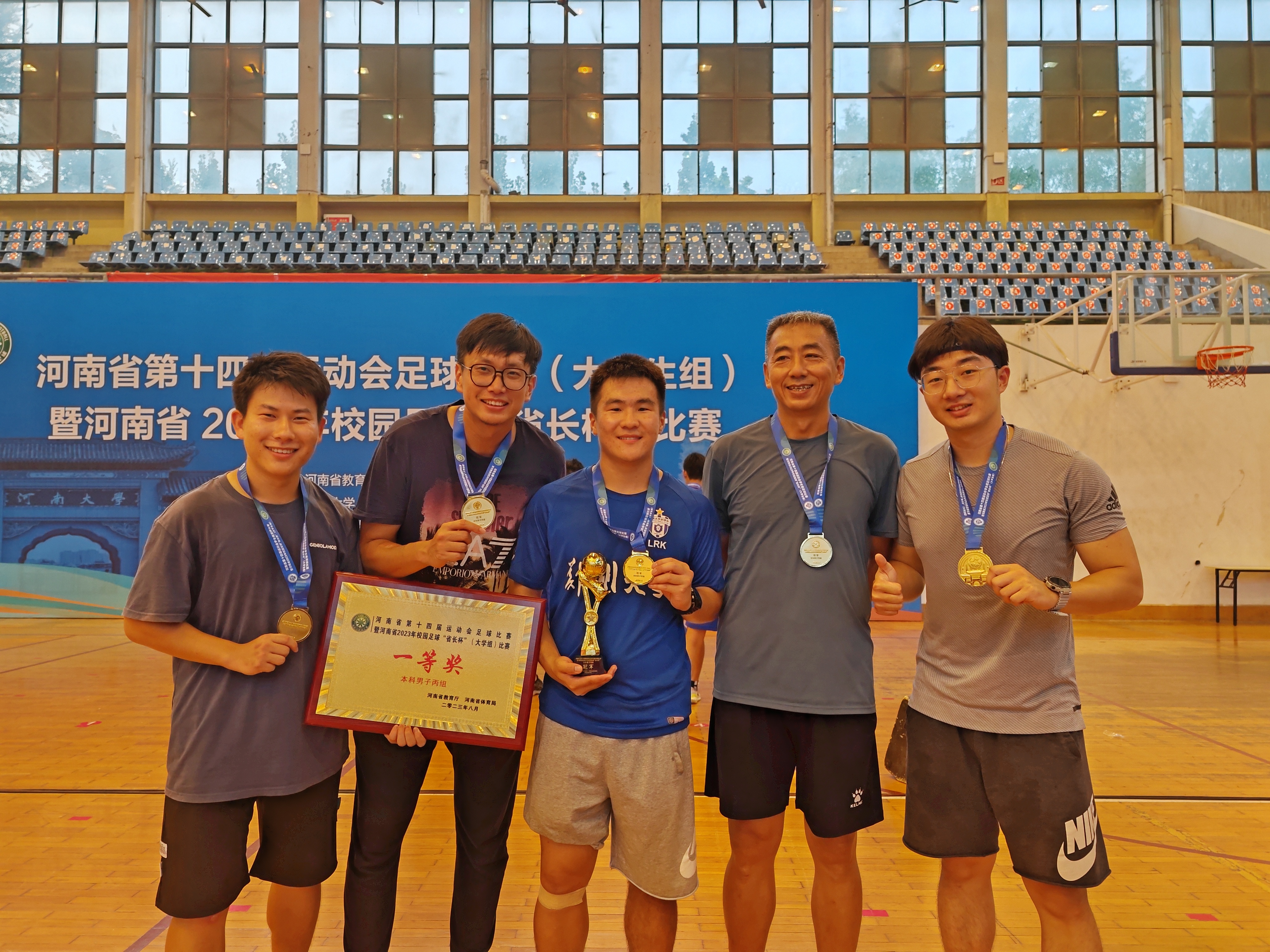 8月14—19日,由省教育厅、省体育局主办,省校足办等单位承办的河南省第十四届运动会学生组足球比赛暨河南省2023年校园足球“省长杯”(大学生组)比赛在河南大学举行,来自全省高校的19支足球代表队参赛。必赢76net线路官网运动健儿团结协作、奋勇拼搏,获得了本科男子丙组一等奖(冠军),本科男子甲组一等奖(季军)的好成绩。本科男子甲组还获得本届运动会(大学生组)唯一的体育道德风尚奖,李昱泽、王城卫、杨文卓、张贤刚四名同学获得优秀运动员,牛岭老师获得优秀教练员称号。