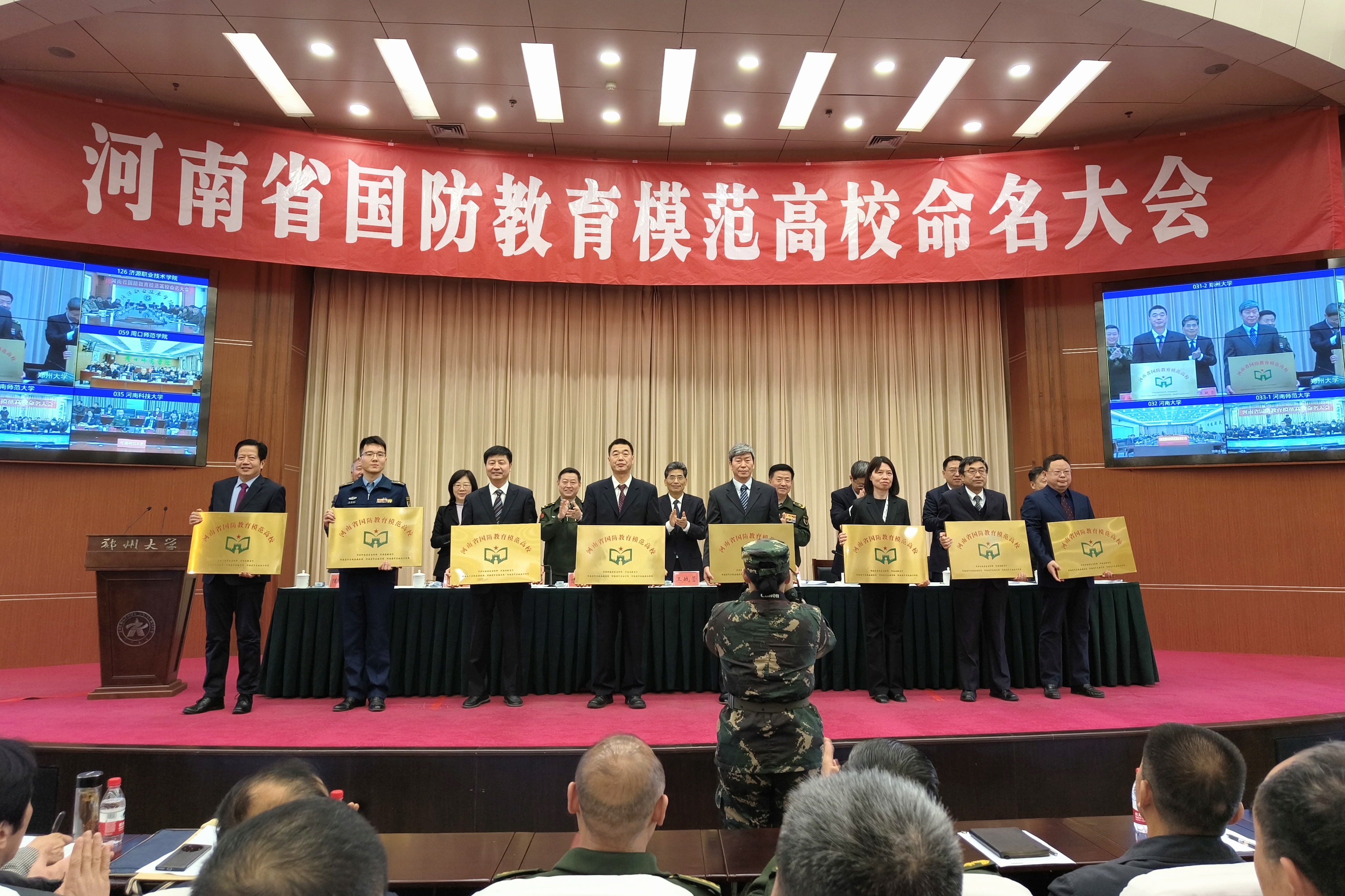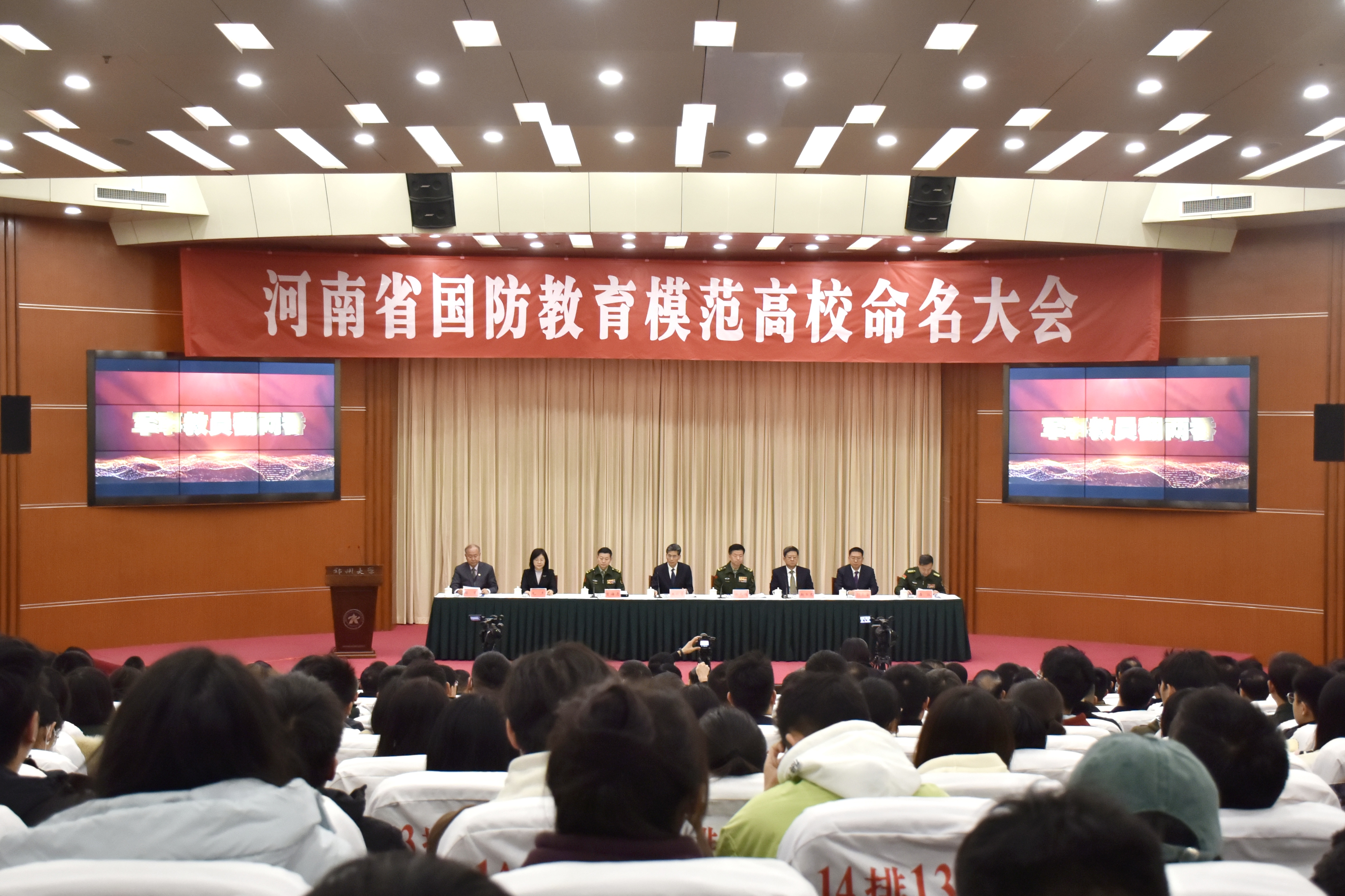 为深入学习贯彻习近平总书记关于加强全民国防教育的重要指示精神,持续推动全省高校国防教育高质量发展。11月16日,河南省国防教育模范高校命名大会在必赢76net线路官网召开。省委常委、宣传部长王战营出席会议并讲话,省委常委、省军区少将政委徐元鸿主持会议。省军区少将副政委兼纪委书记曾海清,省政府副秘书长赵学东,省教育厅党组书记、厅长毛杰,必赢76net线路官网党委书记别荣海出席会议。雷锋杂志社总编辑、解放军报原副总编辑陶克少将,国防大学安全学院大校副教授潘政,中国大学生体育协会国防体育分会秘书长王小宁到会指导。部分省直机关、省军区相关部门、郑州市及驻郑高校相关负责人,省国防教育师资库讲师代表和优秀学生志愿者代表现场参加会议。全省17个省辖市依托视频会议系统开设分会场。