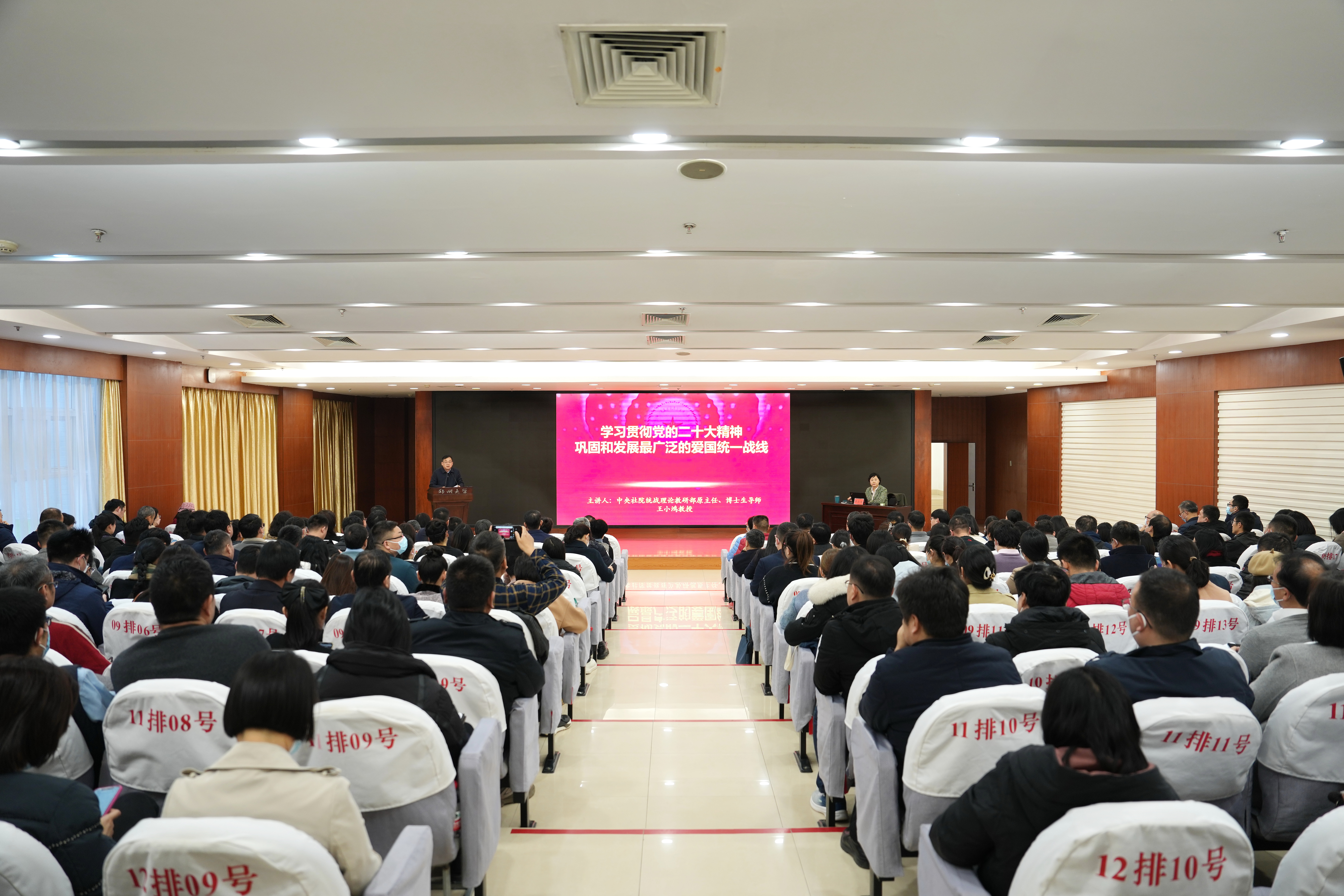 为推动必赢76net线路官网统一战线深入学习贯彻党的二十大精神,11月27日,学校邀请国内知名统战理论专家、中央社会主义学院教授、博士生导师王小鸿作《学习贯彻党的二十大精神 巩固和发展最广泛的爱国统一战线》的专题报告,此次报告也是学校统一战线第十三期的“同心讲堂”。在校的党外省级以上人大代表、政协委员,党外处级干部,各民主党派、统战团体班子成员和部分骨干成员,学校统一战线(民族宗教)工作领导小组成员单位负责人,各基层党组织统战委员,马克思主义学院师生代表,郑州西片区高校部分统战干部和统战成员代表200余人参会,报告会由校党委副书记、工会主席韩国河主持。