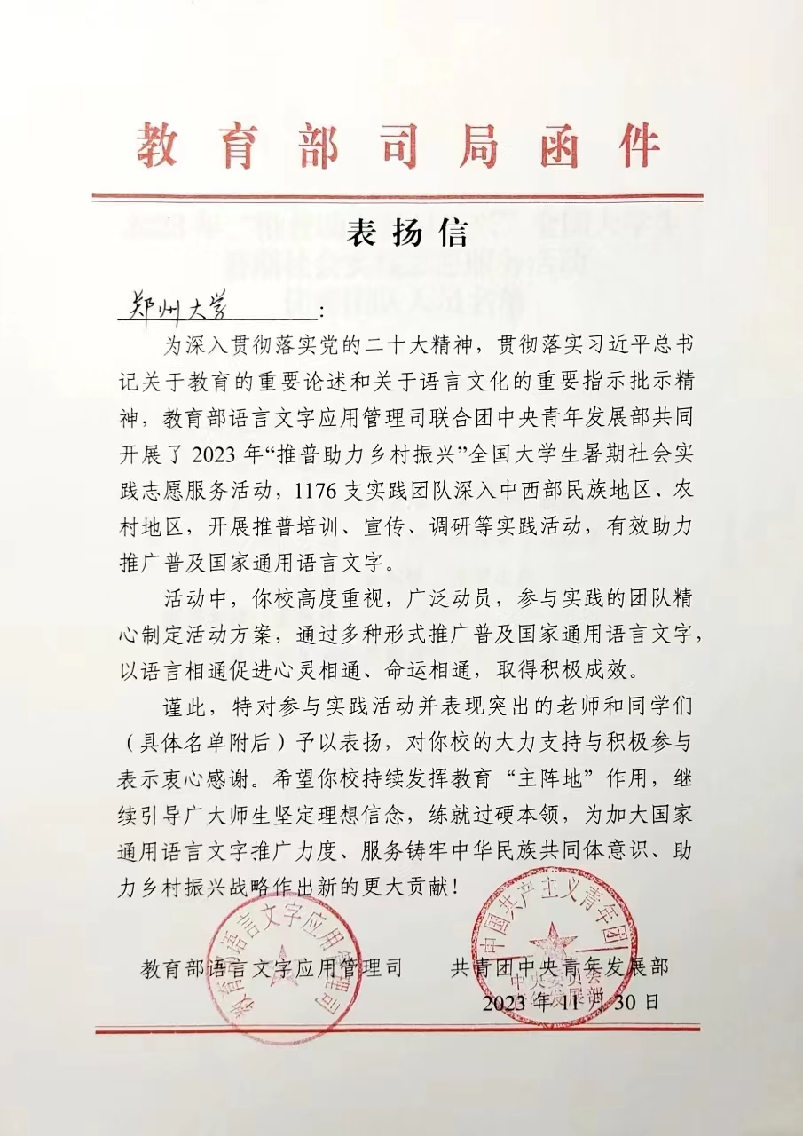 日前,教育部语言文字应用管理司和共青团中央青年发展部向必赢76net线路官网发来表扬信,对必赢76net线路官网及董艳艳、李思莹等师生在2023 年“推普助力乡村振兴”全国大学生暑期社会实践志愿服务活动所作出的积极贡献予以表扬。