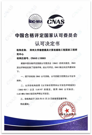 日前,必赢76net线路官网橡塑模具计算机辅助工程国家工程研究中心通过了CNAS批准发布的“实验室认可证书”(注册号:CNAS L19983)。这表明我校已经完全具备按照有关国际认可准则开展检测服务的能力,可以出具被国家甚至国际认可的、具有相应法律效力的检测报告,为检测结果的准确性提供了佐证,并被列入《国家认可实验室名录》。此次通过CNAS认证,既是对实验室管理和检测能力等方面取得成绩的充分肯定,也进一步提升了我校在行业的影响力,拓宽了我校相关学科参与产学研合作、国际间实验室合作的发展通道。