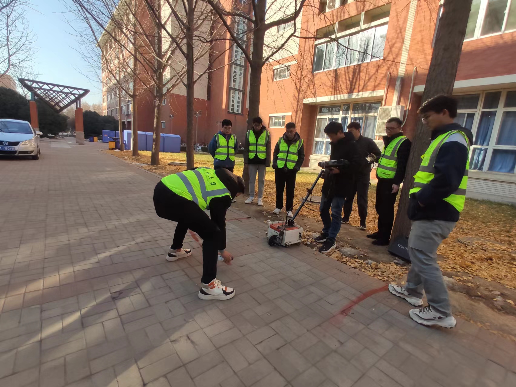 此次安全隐患排查由基建处统筹安排,保卫处、后勤保障中心、主校区、南校园、北校园、东校园综合管理部门积极配合。水利与交通学院方宏远教授担任“双带头人”的基础设施防灾减灾研究生党支部志愿义务承担此次道路隐患探测任务。自2023年12月底至今,工作人员放弃寒假,深入各校区校园和教职工住宅区,重点对主干道、广场、建筑物周边道路等开展一次拉网式隐患排查探测。经过近两个月的工期,共检查路面67.55km,顺利完成校园和教职工住宅区道路隐患排查。基建处根据排查结果及时梳理隐患点并形成台账,各相关部门根据任务分工对排查出的道路病害分别进行整治,加强日常巡视管理。