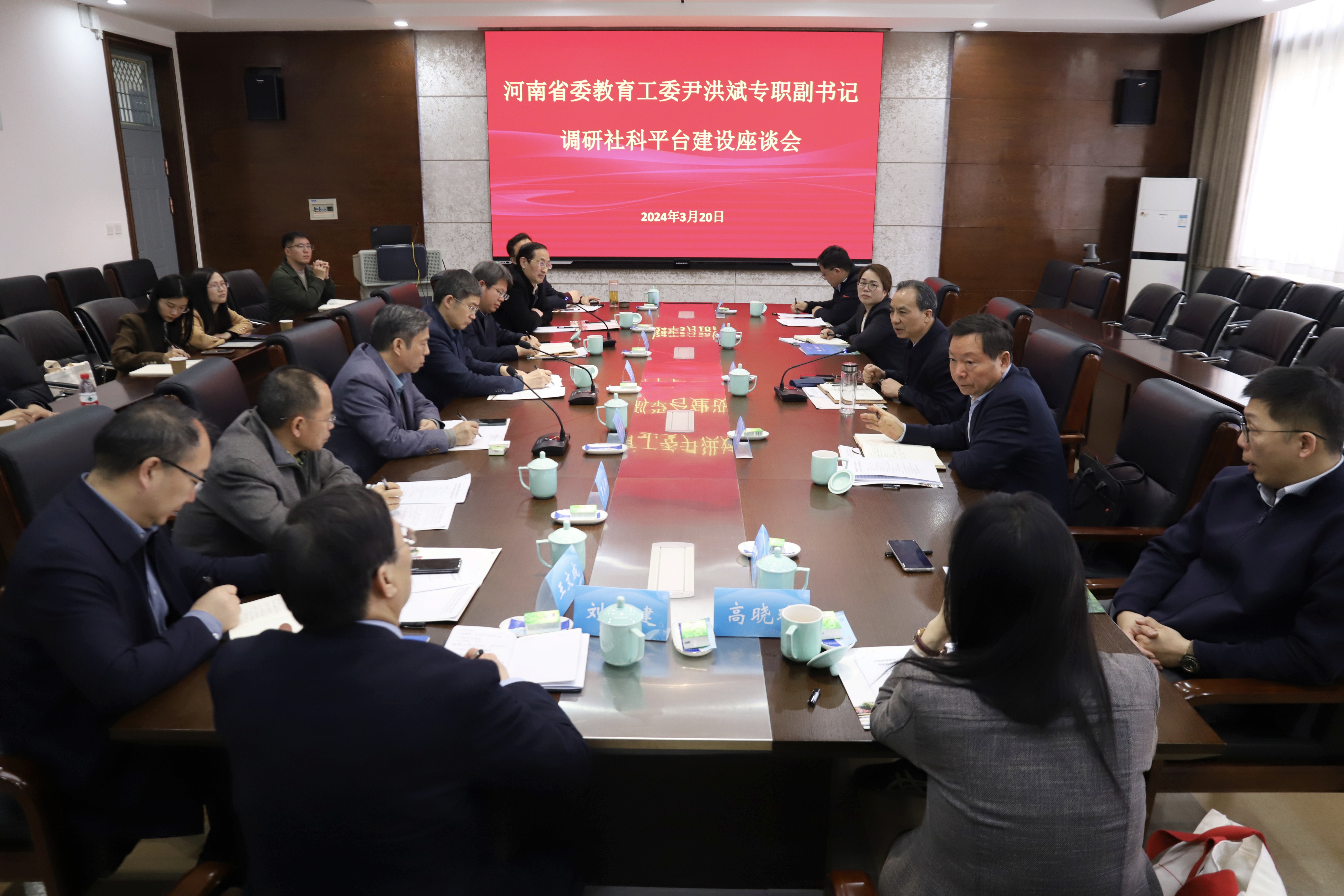 河南省委教育工委专职副书记尹洪斌一行来校调研社科平台建设座谈会现场