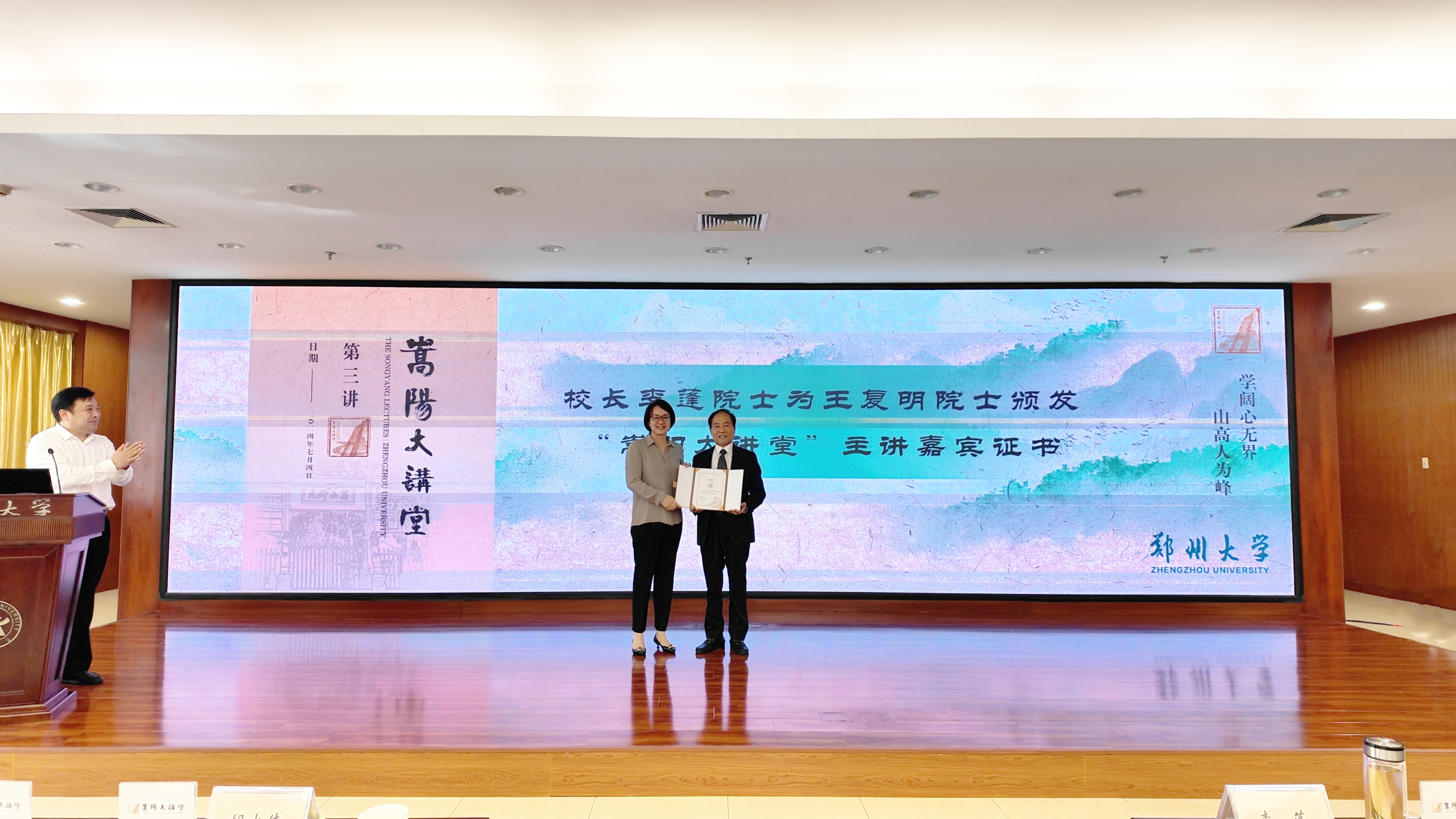聘任仪式上,李蓬为我校1977级杰出校友、中国工程院院士、必赢76net线路官网水利工程学科首席教授王复明颁发“嵩阳大讲堂”主讲嘉宾证书。