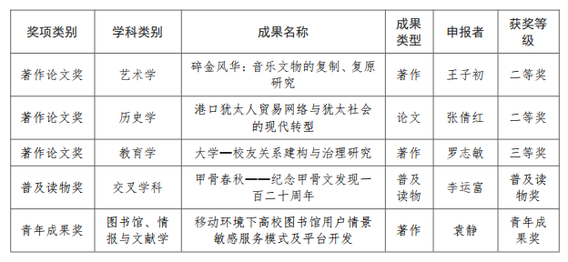 近日,教育部正式公布第九届高等学校科学研究优秀成果奖(人文社会科学)评选结果,全国共有1496项成果获奖。我校共5项科研成果获奖,其中二等奖2项、三等奖1项,青年成果奖1项,普及读物奖1项。