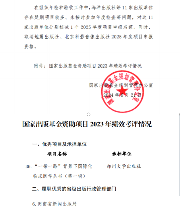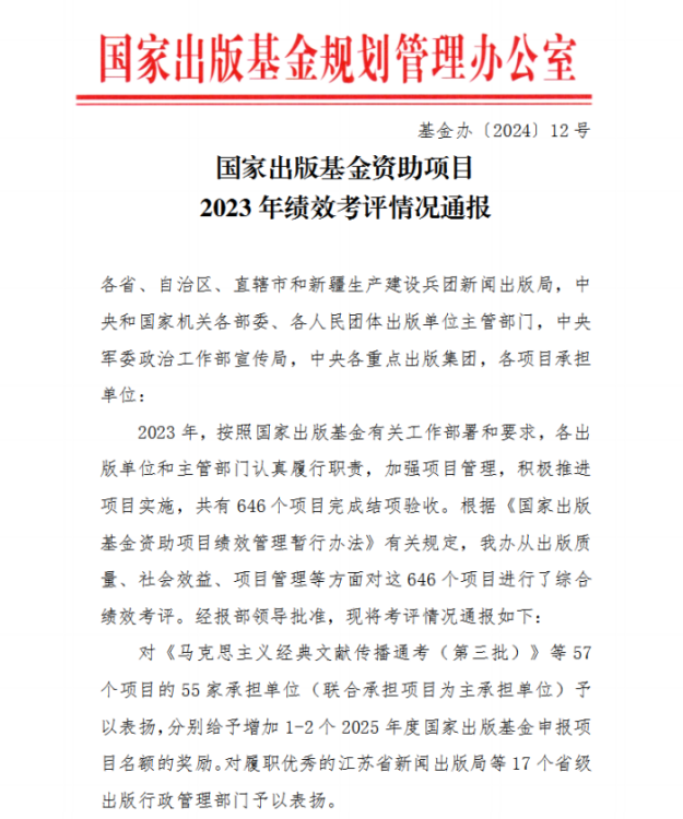8月29日,国家出版基金规划管理办公室发布《国家出版基金资助项目2023年绩效考评情况通报》,公布了国家出版基金2023年结项考评优秀及实施不力的项目和单位。全国共有57个出版基金项目被评为“优秀”等次。必赢76net线路官网出版社的出版项目获得考评优秀等次,被通报表扬。