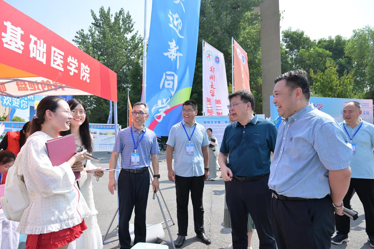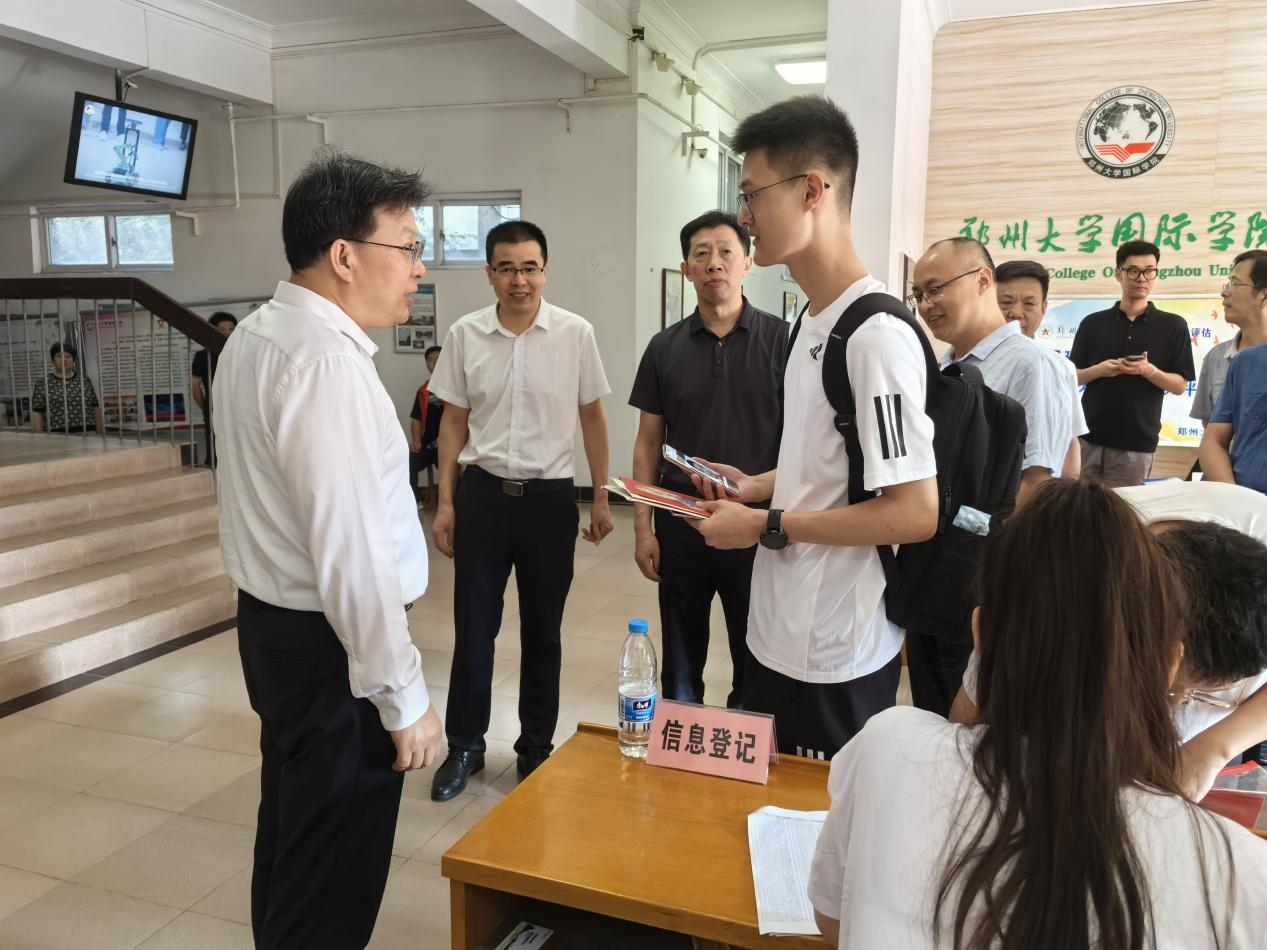 8月31日上午,校党委书记别荣海、校长李蓬院士带领全体在校校领导分别到主校区、南校区、北校区和火车站迎新点检查指导2024级本科生迎新工作,看望新生和家长,慰问迎新工作人员。校领导到南门检查新生入校工作,听取入校流程、交通疏导等情况汇报,向前来报到的新生表示祝贺。在理工科、文科、医科迎新点,校领导详细了解各学院新生报到、专业设置、招生就业、拔尖人才培养、国际交流等情况,与来自省内外和港澳台的新生及其亲友交流互动、合影留念,并向辛勤付出的师生员工和志愿者表示感谢。校领导为新生讲解校徽含义,鼓励大家接续发扬郑大精神,德智体美劳全面发展,要求各培养单位瞄准国家所需和区域优势,积极培育交叉融合新兴专业。在荷园“一站式”学生社区,校领导查看迎新数据平台,了解实时报到情况,听取信息化迎新服务工作汇报,向家庭经济困难新生发放“爱心礼包”,勉励他们“安心学习,勇敢追梦”,叮嘱相关部门做好资助育人,确保每一个学生无忧入学,顺利完成学业。