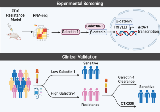 研究团队成功构建了一种获得性紫杉醇耐药的患者来源异种移植(PDX)模型,并利用RNA-seq鉴定出Galectin-1作为介导紫杉醇耐药的关键分子。Galectin-1作为一种分泌蛋白,在紫杉醇耐药患者的血清中显著升高,且与紫杉醇的治疗反应密切相关。通过特异性清除耐药患者血清中的Galectin-1,能够恢复肿瘤细胞对紫杉醇的敏感性。此外,通过基因敲除技术或使用抑制剂OTX008抑制Galectin-1均能有效提高紫杉醇的敏感性。