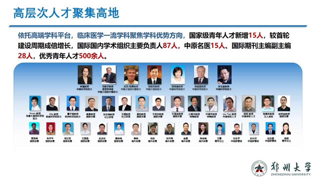 近年来,临床医学学科落实“医学人才特区政策”,依托高端学科平台体系,医学领域战略科学家和领军人才稳步壮大,汇聚国家及行业高层次人才200余人。其中,诺贝尔奖获得者1人、中国科学院院士4人、中国工程院院士1人、中国工程院外籍院士2人,发达国家院士3人、火炬计划1人、教育部长江学者1人、国家级教学名师1人、杰青7人、中原学者10人。在国际国内学术组织任主要负责人87人,为临床医学学科原始创新能力跃升和医学领域关键核心技术突破奠定了坚实基础。