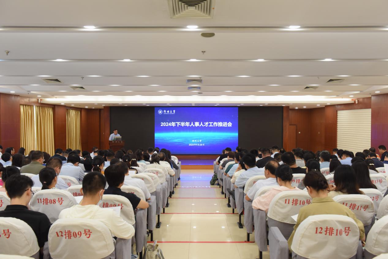 韩国河讲话。他指出,2024年上半年,学校人事人才工作保持了良好的发展势头,人事制度改革稳步推进,各项关键核心指标进展明显,人才发展环境优化提升,同时要进一步关注和破解各单位人才引育任务达成度不均衡等问题。他强调,持续推进人才强校战略,是建设一流大学的关键举措,要不断提高人事人才工作能力和发展质量,全面深化人事制度改革,切实做到“抓一件成一件、引一人成一人”。一要有更高站位、更宽视野、更大格局,落实好“人才强校”战略。坚持把人事人才工作放在更加突出的位置,全面汇聚“全校一盘棋、上下一条心”的工作合力。一方面,学校将持续优化人才引育模式,加强人才培养支持政策,创优人才发展环境,加快打造一流师资队伍;另一方面,各单位要以“学科建设年”为契机,深度挖掘学科资源和自身优势,千方百计吸引优秀人才,多措并举培养潜力人才,为推动学科创新发展集聚人才力量。二要有更大魄力、更多担当、更好方法,推动人事人才体制机制改革。以人事制度改革为牵引,全面加快推进学校综合改革。围绕“院办校”改革,推动管理重心下移,为学院赋能,为人才松绑,充分释放创新活力。同时学院要强化“接得住、用得好”的主动意识,自觉落实人事人才体制机制改革相关任务,真抓实干,主动作为,切实以强院带动兴校。三要有更优谋划、更强举措、更细工作,做好下半年人事人才工作。聚焦学科特聘教授校内遴选工作、河南省引才项目、青年学者国际论坛、教师聘期考核结果运用等重点工作,强化校院协同发力,抓好工作末端落实,确保各项工作高效高质有序推进,努力交出一份优异的人事人才年终答卷。